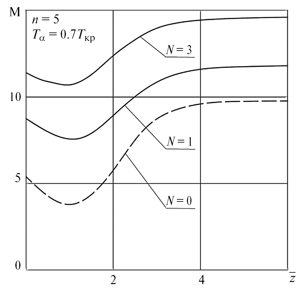На рис. 1 представлены зависимости критической скорости обтекания потоком в числах Маха от безразмерной толщины свода цилиндра при однореберном и трехреберном подкреплении, где N – число шпангоутов. Для сравнения штриховой линией представлена зависимость критической скорости оболочки при отсутствии шпангоутов. Оболочки нагружены осевой сжимающей силой, величина которой составляет 70% от критической (Tкр – критическая сила потери устойчивости неподкрепленной оболочки).