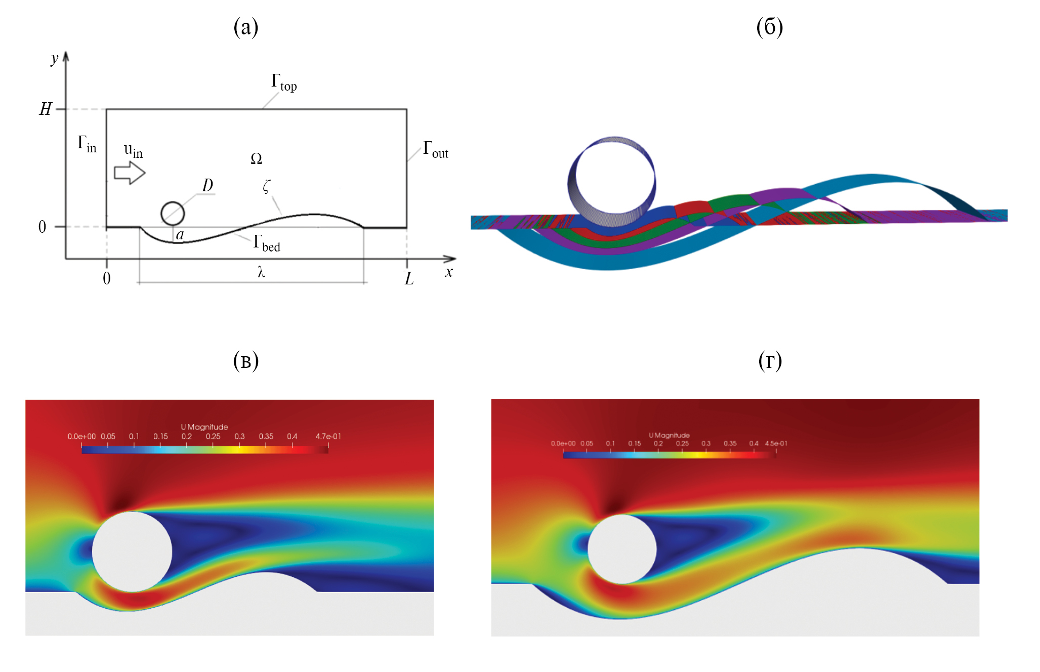 Для численного расчета напряжений на синусоидальном дне использовался открытый программный комплекс OpenFOAM. Рассматривались обтекания цилиндра (диаметр D = 0.1 м) с различными формами донной поверхности потоком воды со скоростью 0.4 м/c. Определялись напряжения на донной поверхности для синусоидальных форм с длинами волн λ = 0.125, 0.2, 0.3, 0.4, 0.6 и крутизной q = a / λ = 0.08. На рис. 3 представлены постановка задачи (а) и различные формы донных синусоидальных волн (б); результаты расчета обтекания цилиндра над донными волнами: длина волны 3D (в) и длина волны 6D (г).