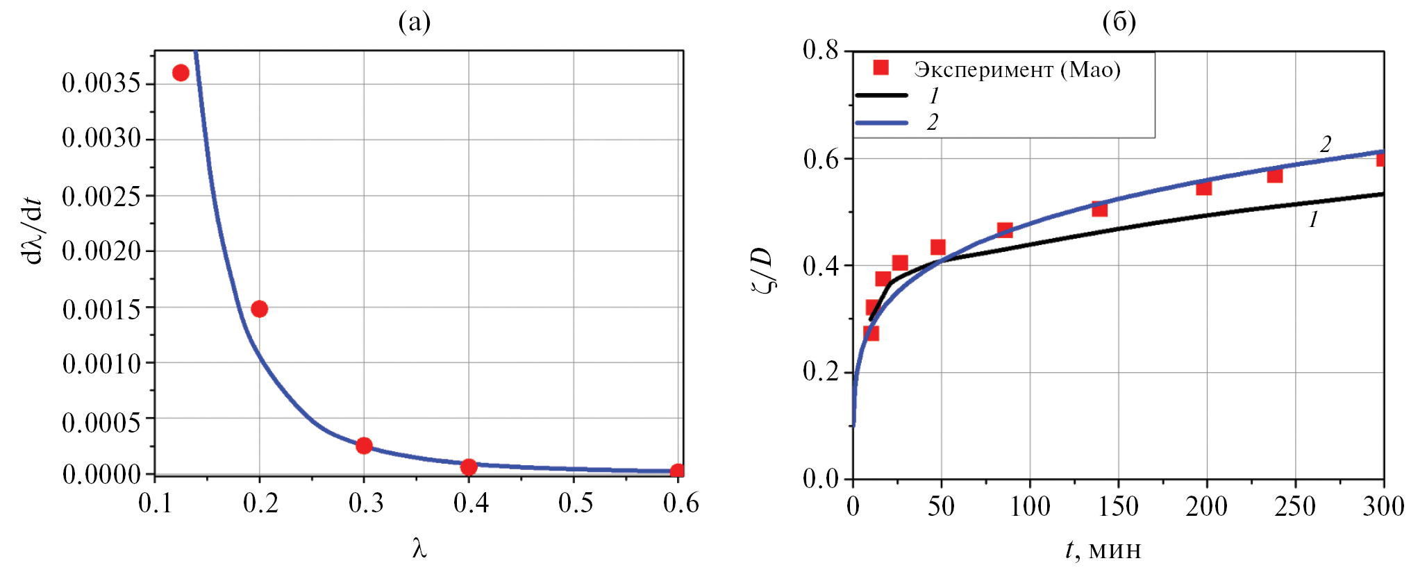Методом наименьших квадратов из системы уравнений (10) находим коэффициенты интерполяционной функции lnA = −12.47, A = 0.00000385, n = 3.42. Сравнение интерполяционной кривой с представленными в табл. 1 красными точками приведено на рис. 4а. Решение определяется по формуле (11). Подставляя найденные значения A, n, получим