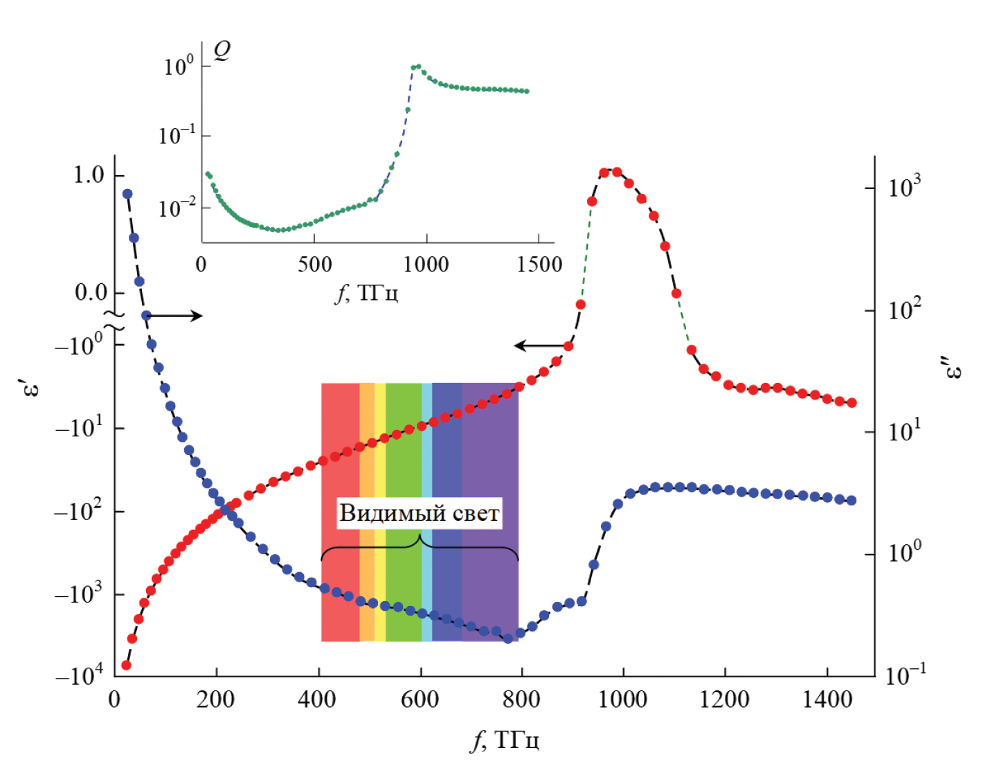 где n׳ и n״ – действительная и мнимая части показателя преломления. Эта добротность не превышает значения 0.5 при отрицательных εʹ, как это было установлено в [12], однако в области положительных εʹ она имеет максимум Q ~1.0 на частоте f ~955 ТГц.