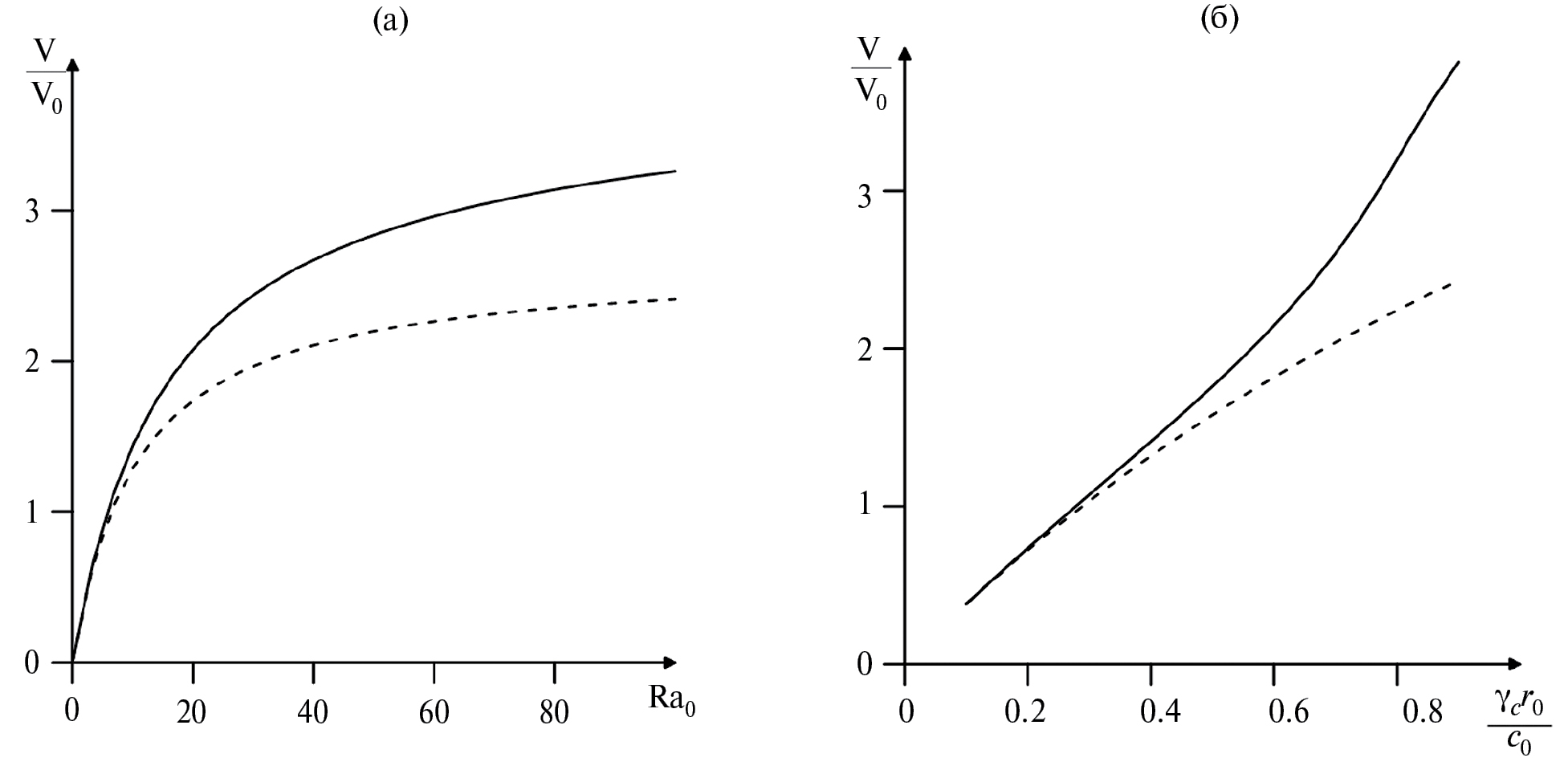 Рис. 3. Зависимость средней скорости фильтрации растворителя через полупроницаемое включение: а – от числа Рэлея при ki/ke = 0.1 и γcr0 /c0 = 1/3; б – от приведенного градиента концентрации при Rao = 30. Пунктиром показано одночленное приближение решения. v0 = 0.03 м/год; c0 = 30 г/л; γcr0/c0 = 1/3 .