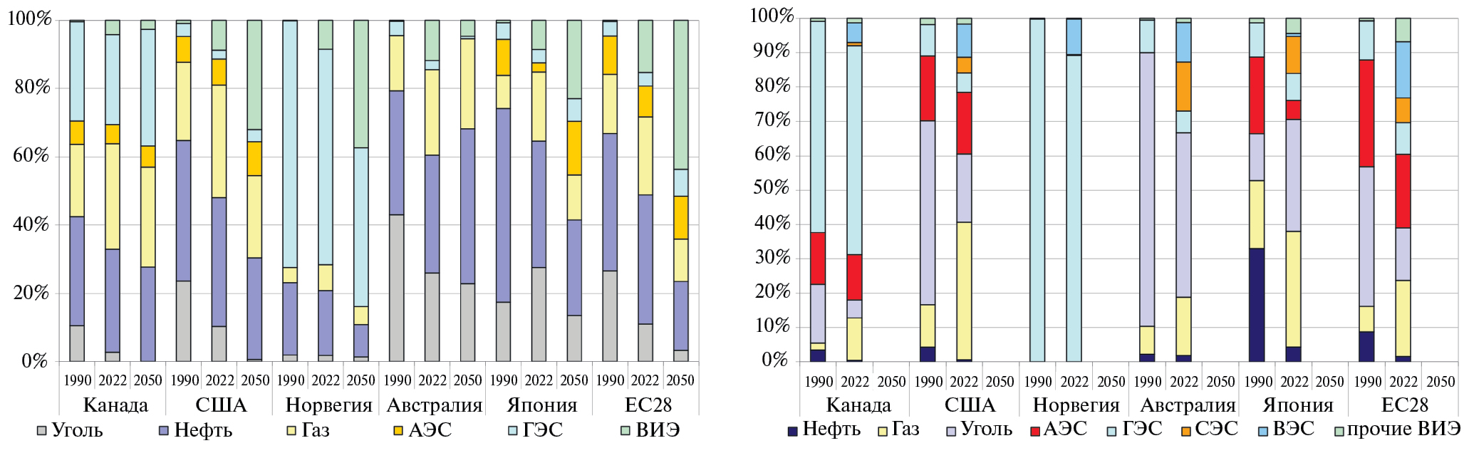 За период 1990–2022 г. в топливно-энергетическом балансе развитых стран произошли значительные изменения (рис. 2а). Во всех странах заметно (в 1.5–3 раза) снизились объемы потребления угля и его доля в энергобалансе (за исключением Японии, где после аварии на АЭС Фукусима в 2011 г. выработка закрытых атомных станций была временно замещена угольными ТЭС) и в 1.5–2 раза выросла доля природного газа в национальном энергопотреблении. Также для всех этих стран характерен многократный рост использования ВИЭ. Доля безуглеродных источников энергии (ГЭС, АЭС и ВИЭ) в суммарном потреблении первичных энергоресурсов составила в 2022 г. более 70% в Норвегии, около 45% в Канаде, более 30% в ЕС и 15–20% в США, Японии и Австралии.