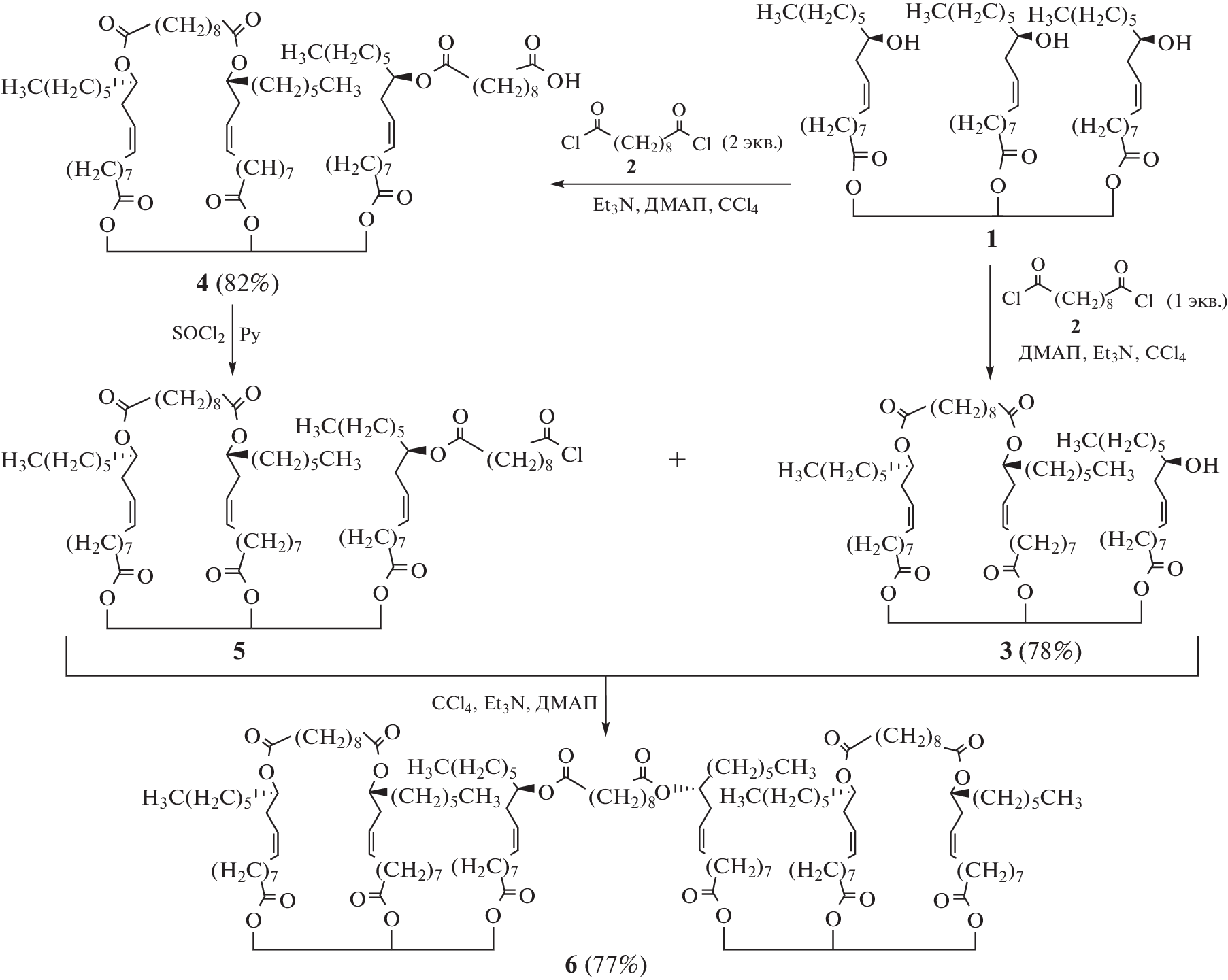 An effective synthesis of optically pure macrocyclic mono- and dinuclearpolylactones is proposed, based on the condensation of a natural triol – castor oil with sebacic acid dichloride, taken in ratios 1 : 1 or 1 : 2, in boiling carbon tetrachloride in the presence of triethylamine and the catalyst N,N-dimethylaminopyridine.