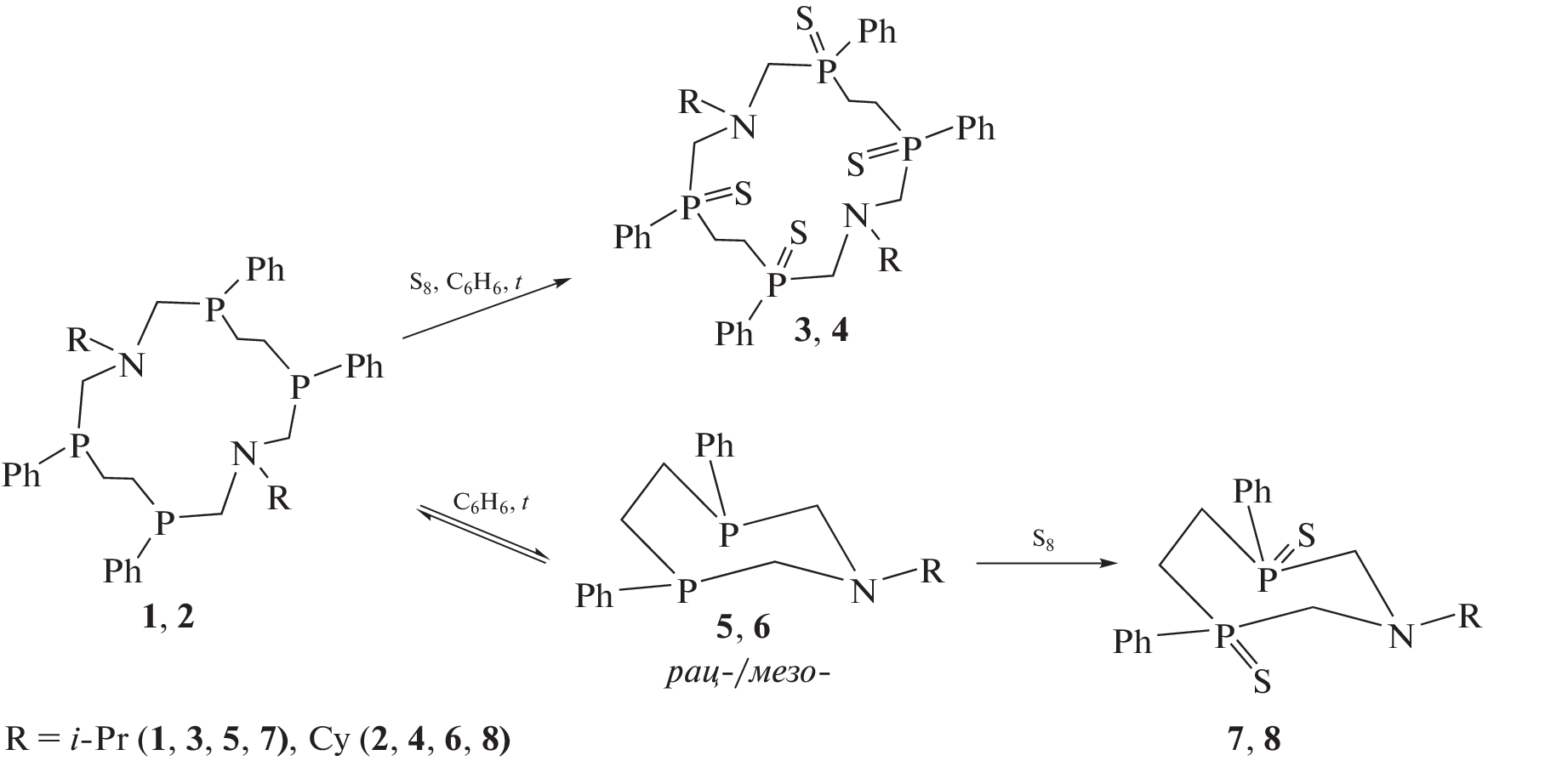 The approach to the synthesis of bis-phospninesulfides and nickel and platinum chelate complexes of 1,3,6-azadiphosphacycloheptanes is supposed. The approach is based on the ability of 14-membered 1,8-diaza-3,6,10,13-tetraphosphacyclotetradecanes undergo the reversible transformation to the mixture of meso- and rac-isomers of 7-membered bisphosphines during the solution. The reaction of 1,8-diaza-3,6,10,13-tetra-phosphacyclotetradecanes with elementary sulfur results in 14-membered tetra(phosphinesulfides) or 7‑membered bis(phosphinesulfides) that depends on the reaction conditions. The reaction of 1,3,6-azadiphosphacycloheptanes, forming by the reversible dissociation of 14-membered tetraphosphines in chloroform, with Ni(CH3CN)6(BF4)2 and Pt(COD)Cl2 give corresponding chelate complexes. The structures of meso-isomer of 1-cyclohexyl-3,6-diphenyl-1-aza-3,6-diphosphacycloheptan-3,6-disulfide 8, bis-(κ2-1-isopropyl-3,6-diphenyl-1-aza-3,6-diphosphacycloheptane)nickel bis(tetrafluoroborate) 9, bis-(κ2-1-icyclohexyl-3,6-diphenyl-1-aza-3,6-diphosphacycloheptane)chloronickel tetrafluoroborate 10 and cis-dichloro-(κ2-1-cyclohexyl-3,6-diphenyl-1-aza-3,6-diphosphacycloheptane)-platinum(II) 13 were established by single crystal XRD analysis.