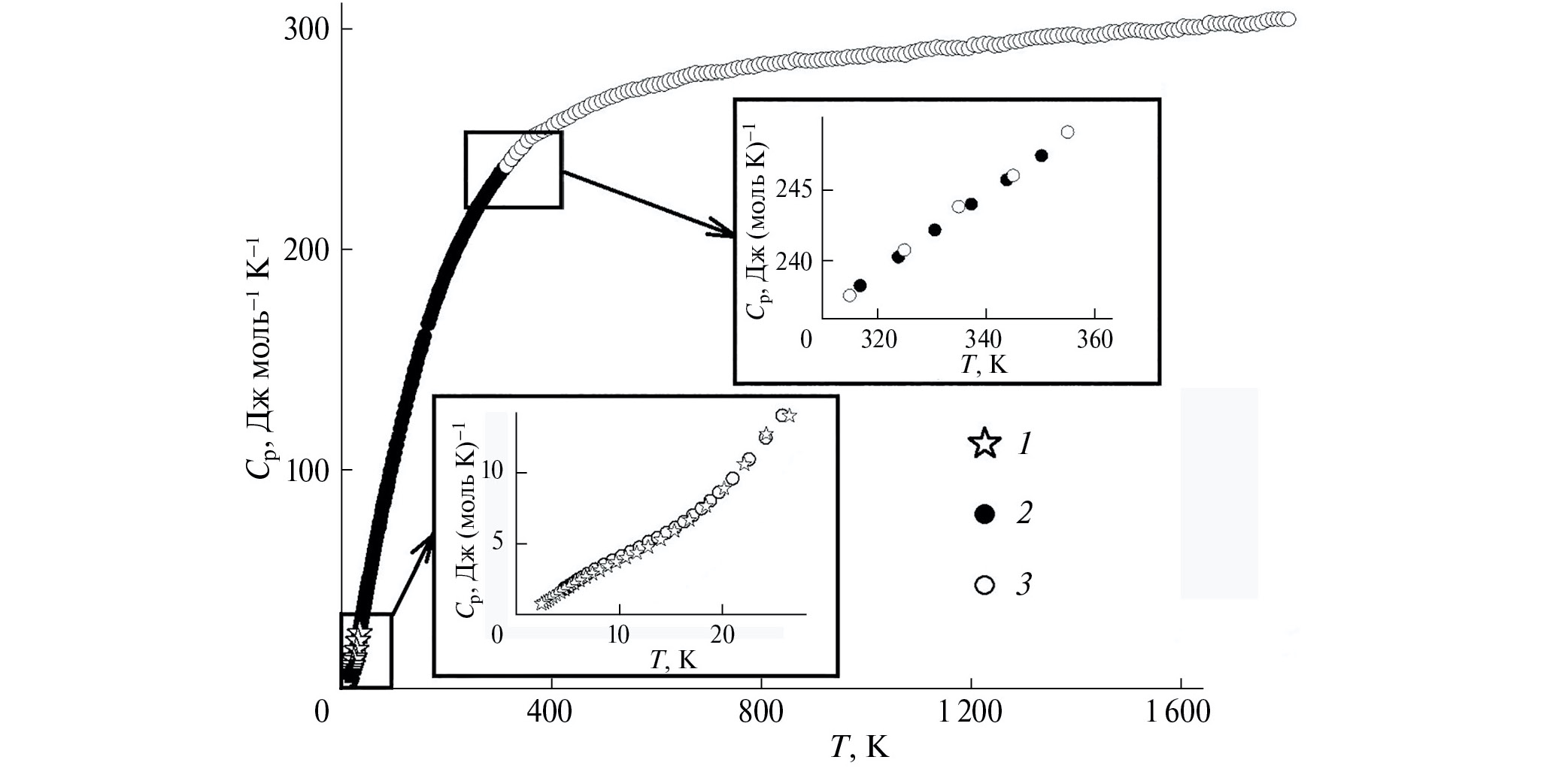 Измерения молярной теплоемкости выполнены тремя методами калориметрии: релаксационной в интервале 2.39–24.97 K (30 точек), адиабатической в области 4.62–350.2 K (138 точек) и дифференциальной сканирующей в интервале 315–1805 K (150 точек) (рис. 3, табл. 1). На врезках рис. 3 приведены области, в которых показана стыковка данных по теплоемкости, полученных разными методами, и видно их взаимное соответствие. Температурная зависимость теплоемкости не содержит признаков структурных превращений во всем интервале измерений.