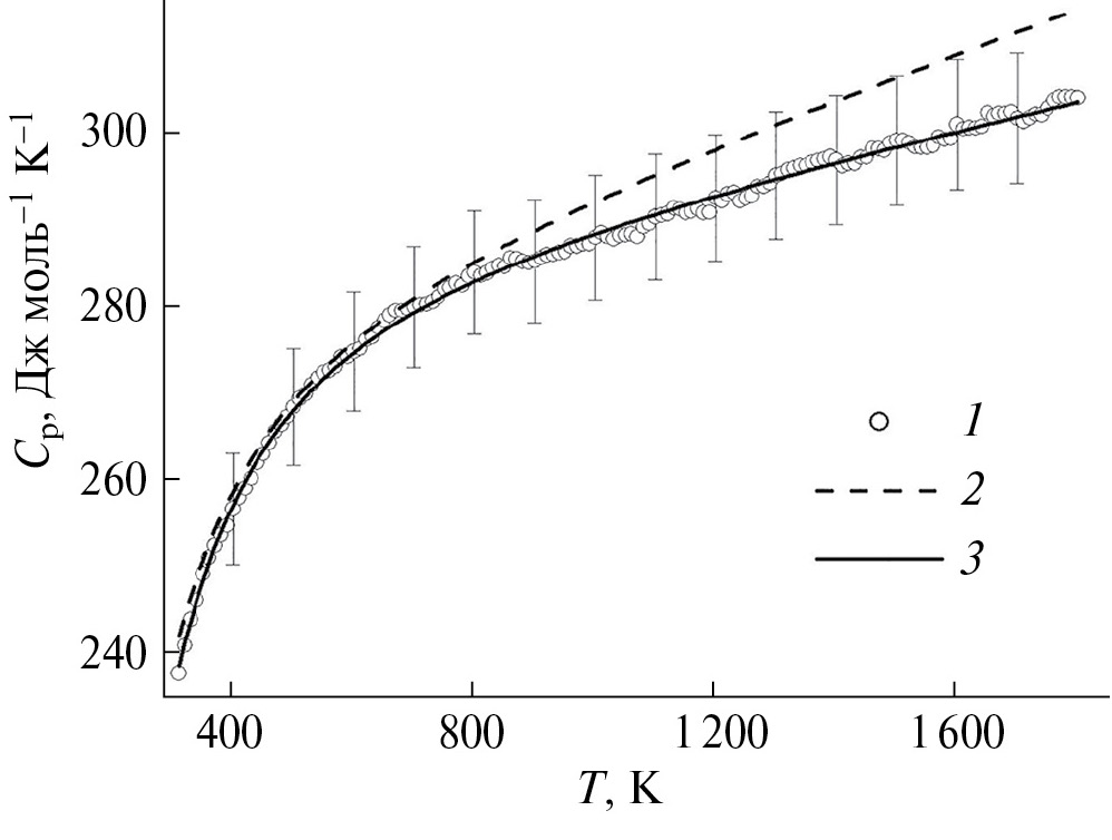 В изученном температурном диапазоне модельные значения теплоемкости находятся практически в доверительном интервале экспериментальных данных, но расположены выше, и при экстраполяции в область более высоких температур могут внести существенные искажения в расчетные данные.