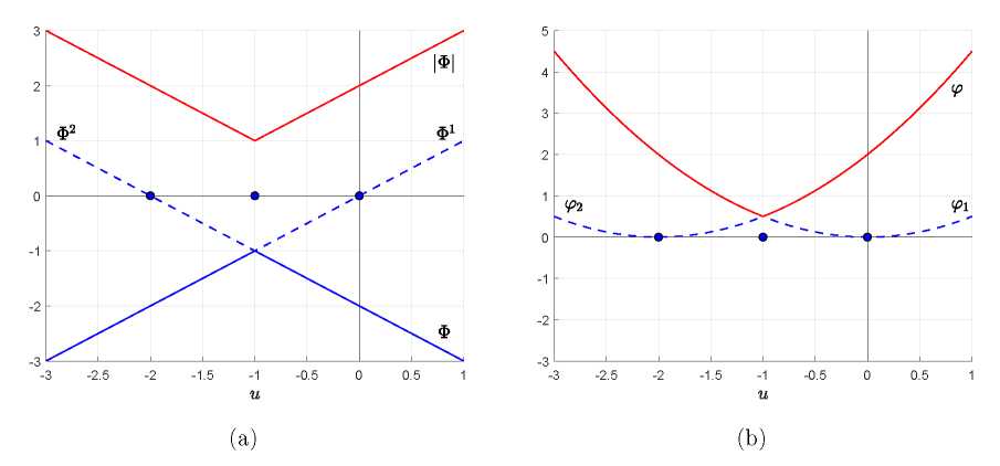 Пусть, например, Тогда естественные соответствующие кусочные отображения имеют вид и (см. графики на рис. 1a). В точке которая не является решением (у задачи (1.15) с указанным вообще нет решений), выполняется Если удовлетворяющее (0.4) отображение выбрано так, что то уравнение (1.1) принимает вид т. е. Тогда для любого
