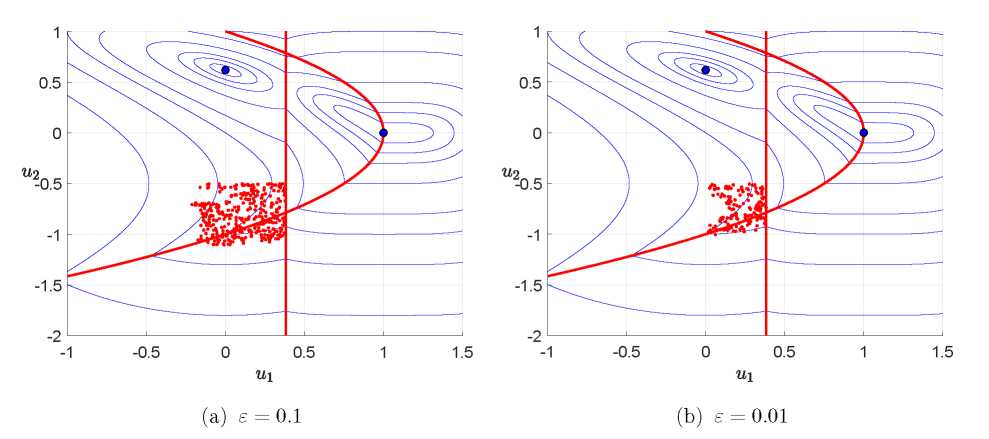 На рис. 2–4 синими точками показаны два решения и данной задачи, а синие линии являются линиями уровня функции Красные линии соответствуют границам между областями активности разных гладких кусочных отображений, и, в частности, состоят из точек в которых содержит более одного индекса.