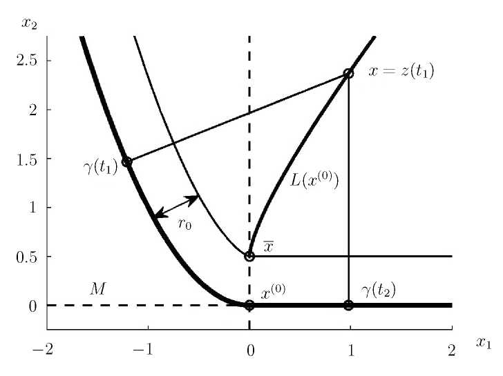 Говоря о приложениях, заметим, что развиваемые алгоритмы и процедуры отыскания меры невыпуклости замкнутого множества имеют практическое значение в задачах оптимального управления. Так, например, если рассматривать M в качестве целевого множества в плоской задаче управления по быстродействию для случая, когда динамика управляемого процесса определяется кругом единичного радиуса с центром в начале координат (см. [10]), то представленная на рисунке биссектриса L является сингулярным множеством функции оптимального результата. В точках этой кривой нарушается единственность оптимальных траекторий. В данном случае из каждой точки кривой L в направлении метрических проекций на целевом множестве сходят ровно две оптимальные траектории. При этом чебышевский слой величины r, является полосой, примыкающей к целевому множеству M, в котором функция оптимального результата сохраняет гладкость.