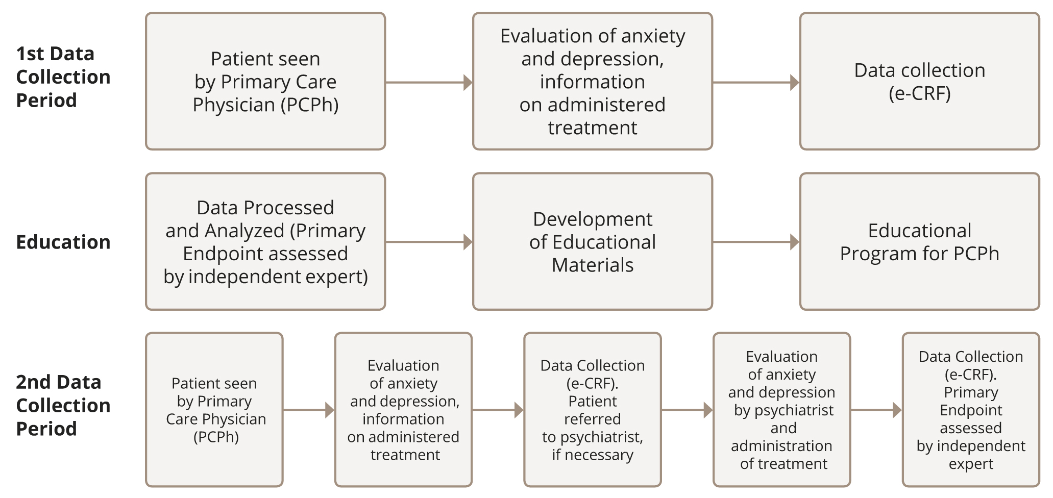 The aim of this study was to explore whether the baseline rates of referrals to psychiatrists and the indicated pharmacological treatment (complying with the screening criteria) received due to depression or anxiety among patients with CVD and DM will significantly change in the primary healthcare facility after the training of PCPhs to deal with comorbid depression and anxiety (including the algorithm for referral to a psychiatrist).