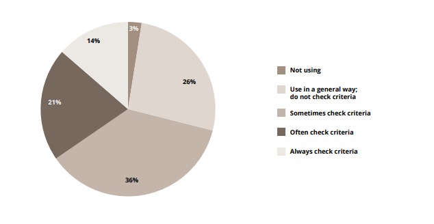Figure 1. Practical use of general diagnostic criteria for the F20 category (schizophrenia) by respondents (n = 639) who simultaneously a) use the ICD-10 diagnosis codes; b) in the year prior to the survey, had diagnosed new patients with psychotic disorders