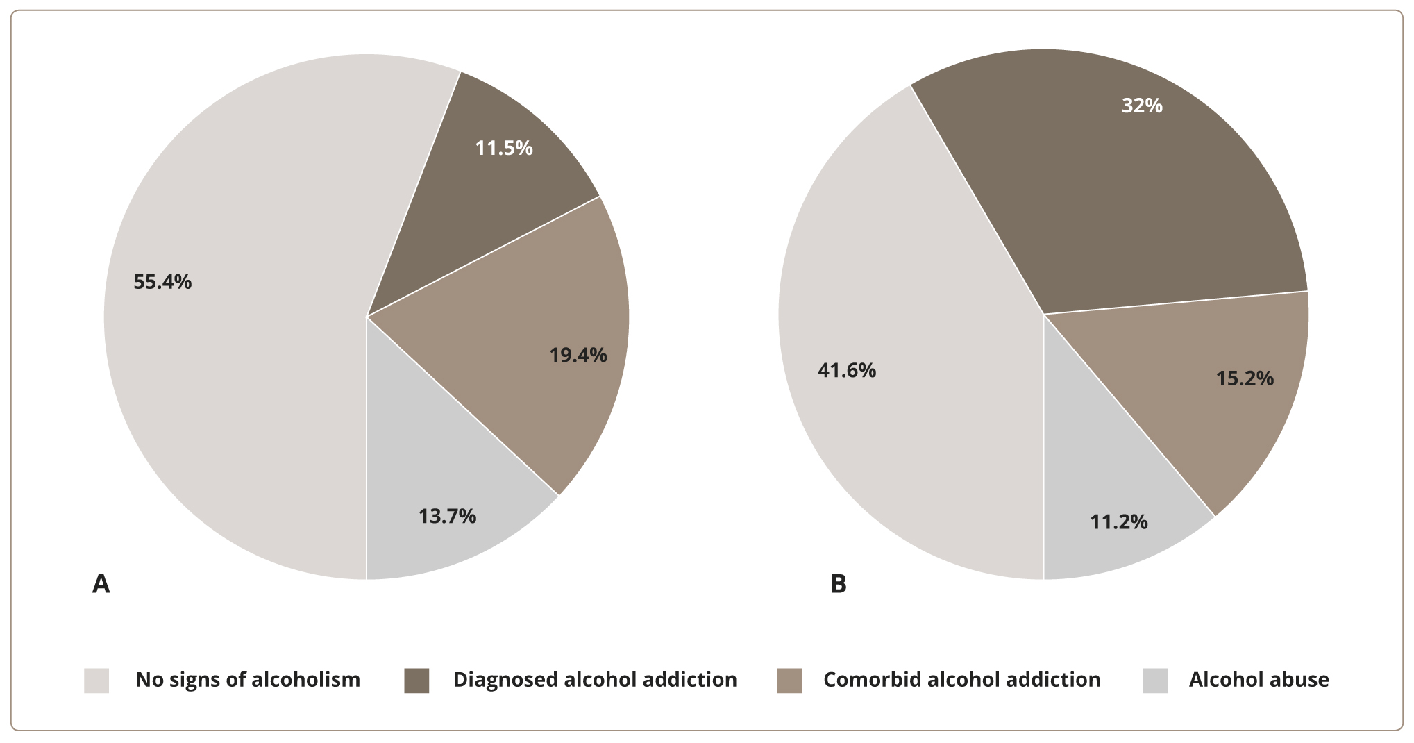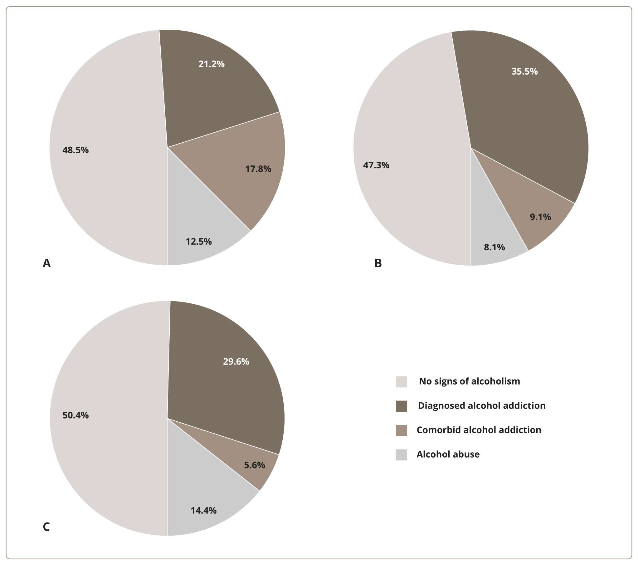 A comparison of the incidence of diagnosed alcohol addiction with other cases of alcohol addiction and abuse is presented in Table 2. Control group 1 included 105 subjects diagnosed with alcohol addiction (35.5%), while in Control group 2 the condition was diagnosed in only 37 subjects (29.8%). There were 27 patients (9.1%) in Control group 1 and 7 patients (5.6%) in control group 2 with identified but not diagnosed addiction; also, there were 24 patients (8.1%) in Control group 1 and 18 patients (14.4%) in Control group 2 who were known to abuse alcohol but did not display a clearly discernible addiction. The overall composition of the patients suffering from alcohol abuse is more clearly presented in Figure 2. All three diagrams in the Figure show the following ratio: 1) patients with no signs of alcohol abuse; 2) patients with an established main diagnosis of “alcohol addiction”; 3) patients with alcohol addiction indicated in the diagnosis as concomitant to the underlying mental disorder, or with addiction indicated in the medical records or in the description of the withdrawal syndrome; 4) with alcohol abuse as comorbidity with other diagnosed mental disorders and without signs of addiction. The first pie chart shows the data of the group of veterans, the second one shows Control group 1, and the third one shows Control group 2.