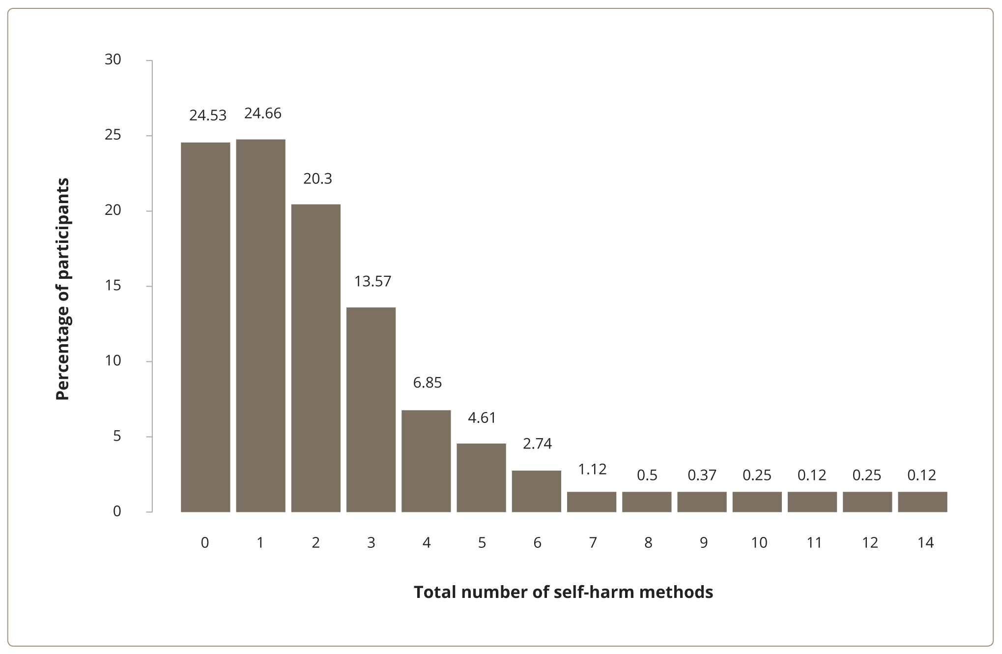 Figure 2. Distribution of the number of different ways of self-harm employed by the same participant.