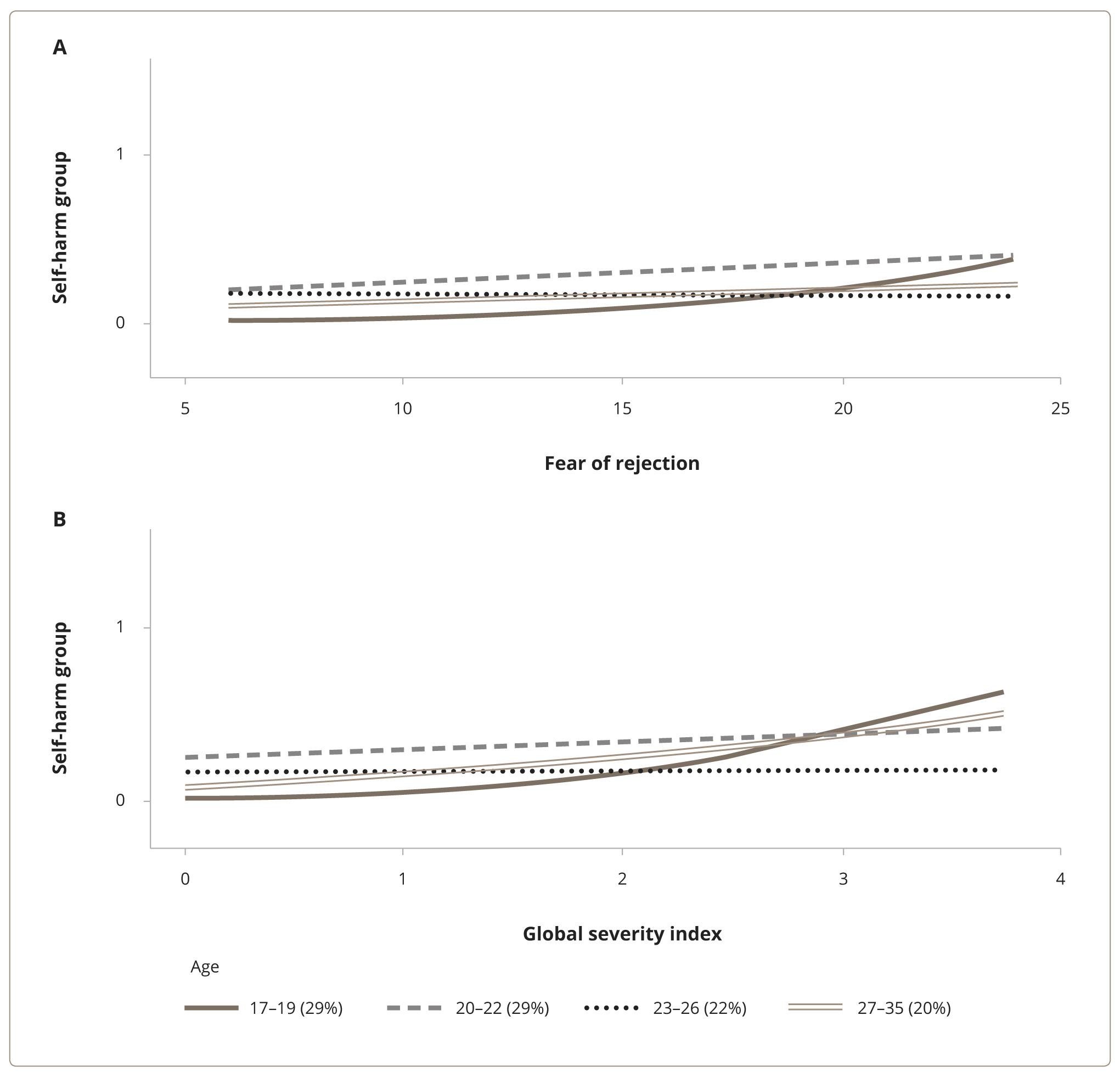 The study showed that fear of rejection and psychopathological symptoms predicted the severity of self-harm measured on the basis of free descriptions. Generally, 20- to 22-year-old participants were more prone to severe self-harm as opposed to superficial self-injuries. However, the relative impact of psychological distress and fear of rejection was more pronounced in younger participants (17–19 years old) compared to older ones (20- to 26-year-olds in the case of the Global Severity Index and 23- to 26-year-olds in the case of fear of rejection), which revealed the age-related aspects of self-harm.
