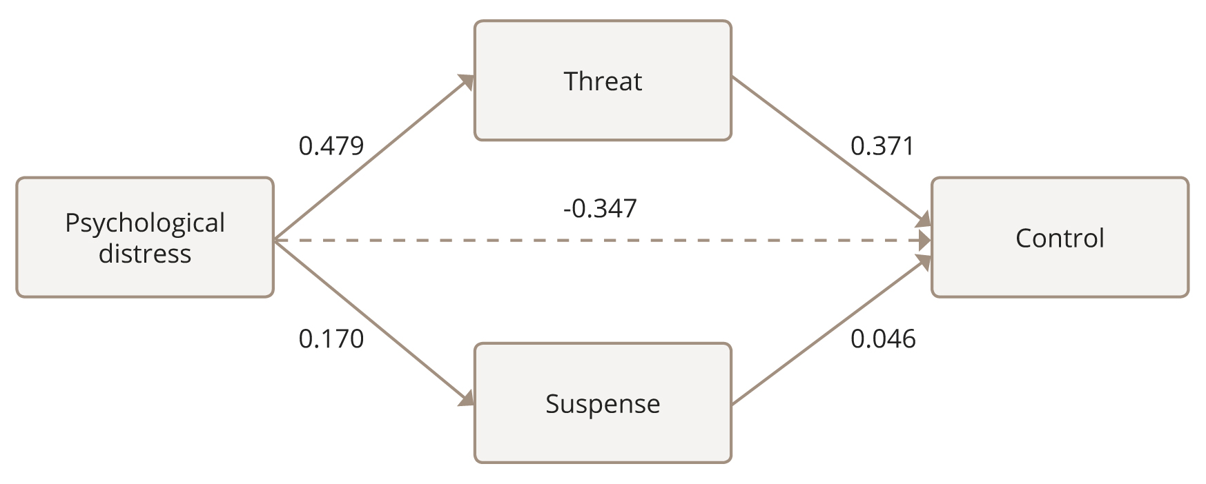 The model constructed reveals the direct and indirect effects of Psychological Distress on the perceptions of the Control over the pandemic, as mediated by Suspense and Threat. Psychological distress decreases the feeling of Control over a pandemic. At the same time, Psychological Distress can indirectly increase the feeling of Control through strengthening the feelings of Threat and Suspense. Thus, if a person perceives the pandemic as threatening, they will pay more attention to controlling it, but if a person’s mental state worsens, it may lead to a feeling of lack of control over the pandemic.