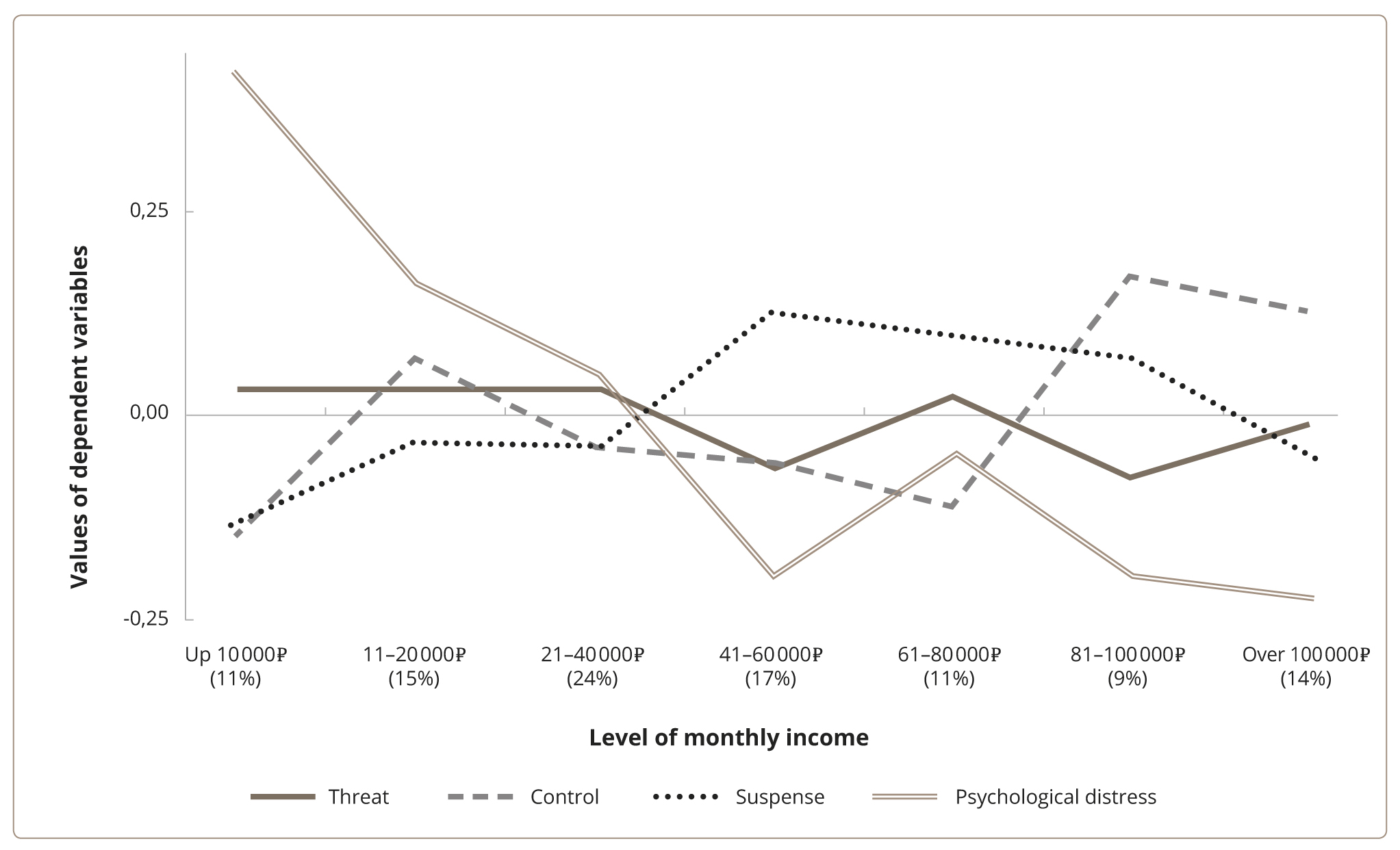 Figure 5. Changes in Psychological Distress and perceptions of the COVID-19 pandemic with the increase in income.