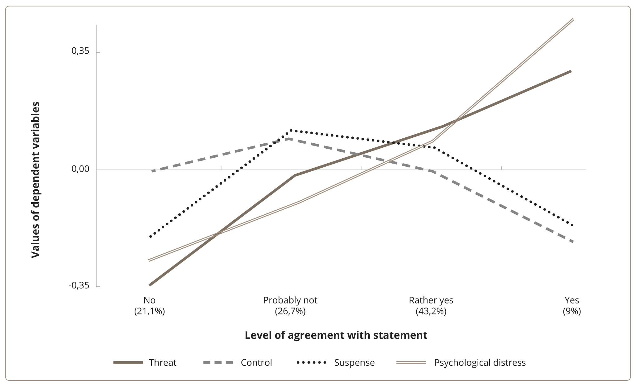 The factor structure of the modified version of the Perceived Stress Scale and State Anxiety Scale was explored in our previous study [21, 31] and indicated that “Psychological Distress” as a factor explains 73% of the general dispersion. Therefore, four factors, including Psychological Distress, Threat, Control, and Suspense were used as variables for further analysis. These factors represent centrally distributed normal values with a mean sample value of 0 and a standard deviation of 1 (Z-scores).