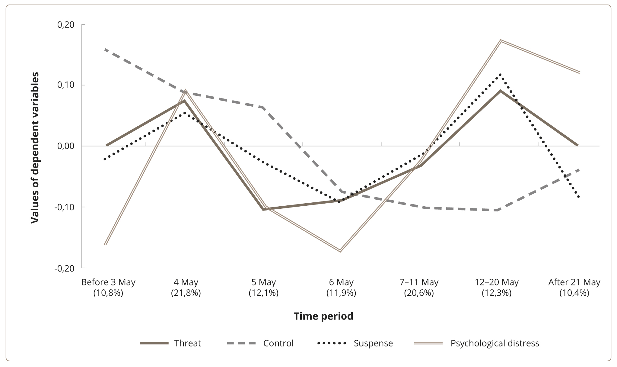 The factor structure of the modified version of the Perceived Stress Scale and State Anxiety Scale was explored in our previous study [21, 31] and indicated that “Psychological Distress” as a factor explains 73% of the general dispersion. Therefore, four factors, including Psychological Distress, Threat, Control, and Suspense were used as variables for further analysis. These factors represent centrally distributed normal values with a mean sample value of 0 and a standard deviation of 1 (Z-scores).