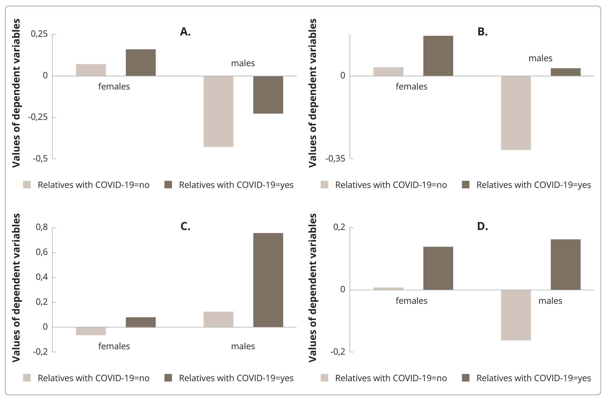 Figure 2. Levels of Psychological Distress and the perceptions of the COVID-19 pandemic in different respondents’ age groups. Note: Here and in the following figures, the values of dependent variables are plotted along the Y-axis. These variables are calculated as factor scores. Therefore, they are standardized and normally distributed variables (Z-score).