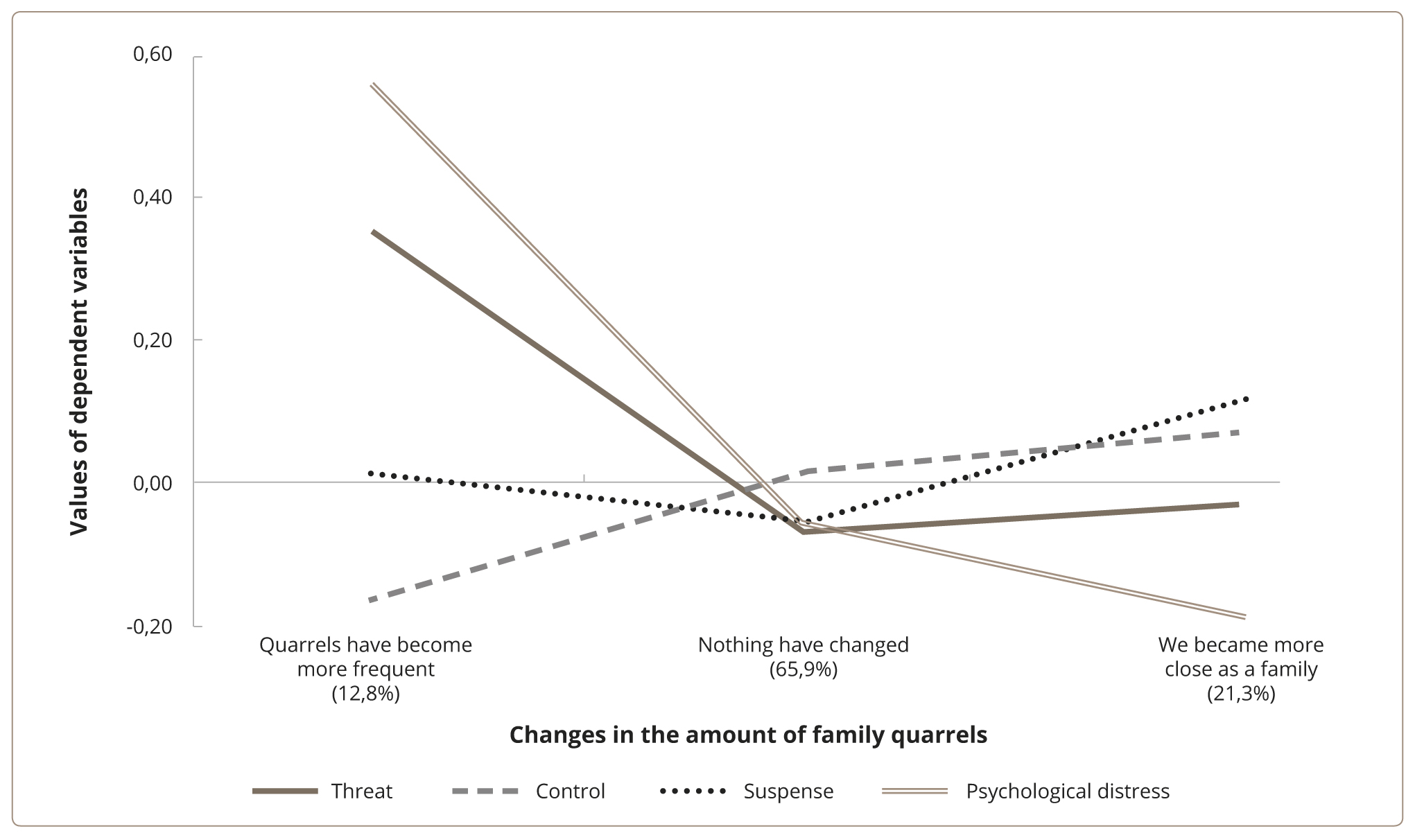 To determine how age affects psychological distress and perceptions of the pandemic, respondents were divided into four age groups. Figure 2 shows the number of each group and representations of the values on the scales under analysis in each group. Since the survey was conducted online, the vast majority of our respondents (over 99%) are people of active age, that is, under 64. Therefore, the age periodization in our survey is limited by this age. The results show that Psychological Distress (F=8.647; p <0.0001) and Threat representations (F=3.782; p <0.010), as well as the perceptions of Control (F=11.984; p <0.0001), are mostly characteristic of younger respondents. It is worth noting that despite lower levels of Psychological Distress and Threat assessment in the older age group, the Suspense is higher in this group, though not to a significant degree.