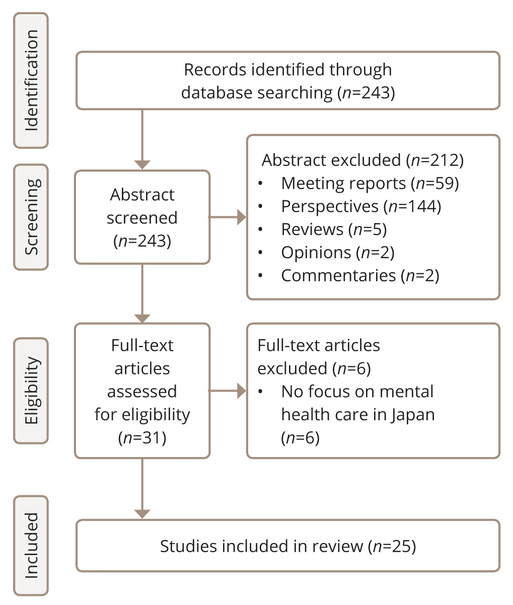 The original search identified 243 potentially relevant studies. Among them, 212 were meeting reports, perspectives, reviews, opinions, and commentaries, which were excluded during the abstract screening stage. The full texts of 31 articles were assessed. Six studies were excluded, since they concerned mental health care outside of Japan. As a result, 25 studies were included (Figure 1). The overall characteristics of the included studies are presented in Table 2.