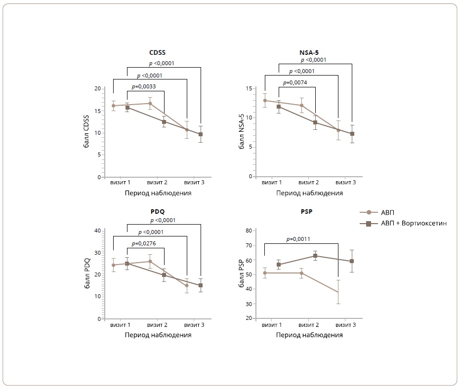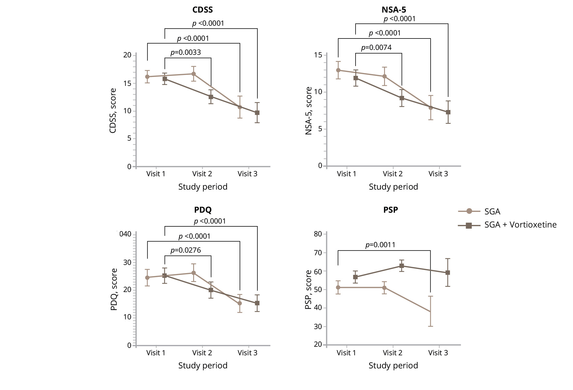 RESULTS: According to the ANOVA results, by the end of the observation period, patients, regardless of their therapeutic group, showed a statistically significant decrease in the level of depression on the CDSS scale, the severity of negative symptoms on the NSA-5 scale, cognitive symptoms on the PDQ-20 scale, as well as an improvement in personality and society, judging by the increase in the total PSP scores. There were also significant differences between the compared main (SGA + vortioxetine) and control (SGA) groups in terms of the changes in the total score on the CDSS and PSP scales. An interesting aspect of the changes in the clinical scores was a noticeable improvement in the SGA + vortioxetine group after 3 months of treatment, in the absence of a similar improvement in the control group, and the achievement of approximately the same scores in both groups after 6 months. In particular, there were significant differences between the SGA + vortioxetine and SGA groups in terms of the mean CDSS (p <0.001), NSA-5 (p=0.003), PDQ-20 (p <0.001), and PSP (p=0.004) scores after 3 months. Analysis of the time before early withdrawal from the study showed that significantly more patients in the SGA + vortioxetine group completed the study program (n=27, 69.23%) compared with the SGA group (n=13, 33.33%) (χ2 =14.618, df=1, p <0.001, log-rank test. The mean survival time in the SGA group was significantly (p <0.001) less and amounted to 101.436 days (95% CI: 81.518–121.354), and in the SGA + vortioxetine group it amounted to 161.744 days (147.981–175.506). The relative risk of full study completion in the vortioxetine + SGA group compared with that in SGA was 3.618 (1.871–6.994).