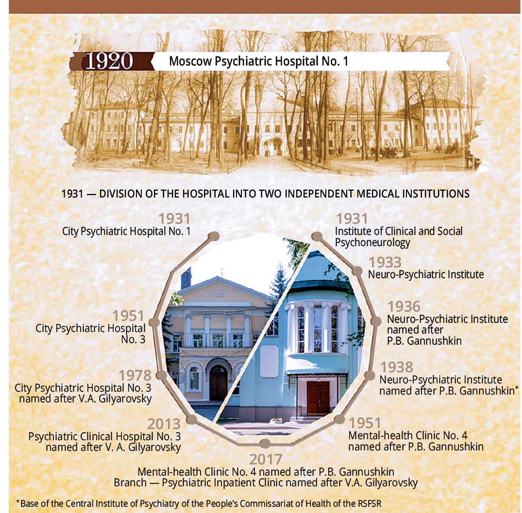 However, the revolution of 1917 and the subsequent division of the hospitals sowed confusion into the “question of anniversaries”. In the spirit of Soviet traditions, Preobrazhenskaya Hospital was stripped of its former name in 1920 and became Moscow City Hospital No. 1. What’s more, in 1931, it was divided into two independent medical institutions with different goals and missions. The hospitals kept changing names, numbers, internal organizational structure, and overall scope of activities, and only relatively recently, in 2017, did the two hospitals return to their historical roots by merging under the name of P.B. Gannushkin Mental-health Clinic No. 4 (Figure 4).