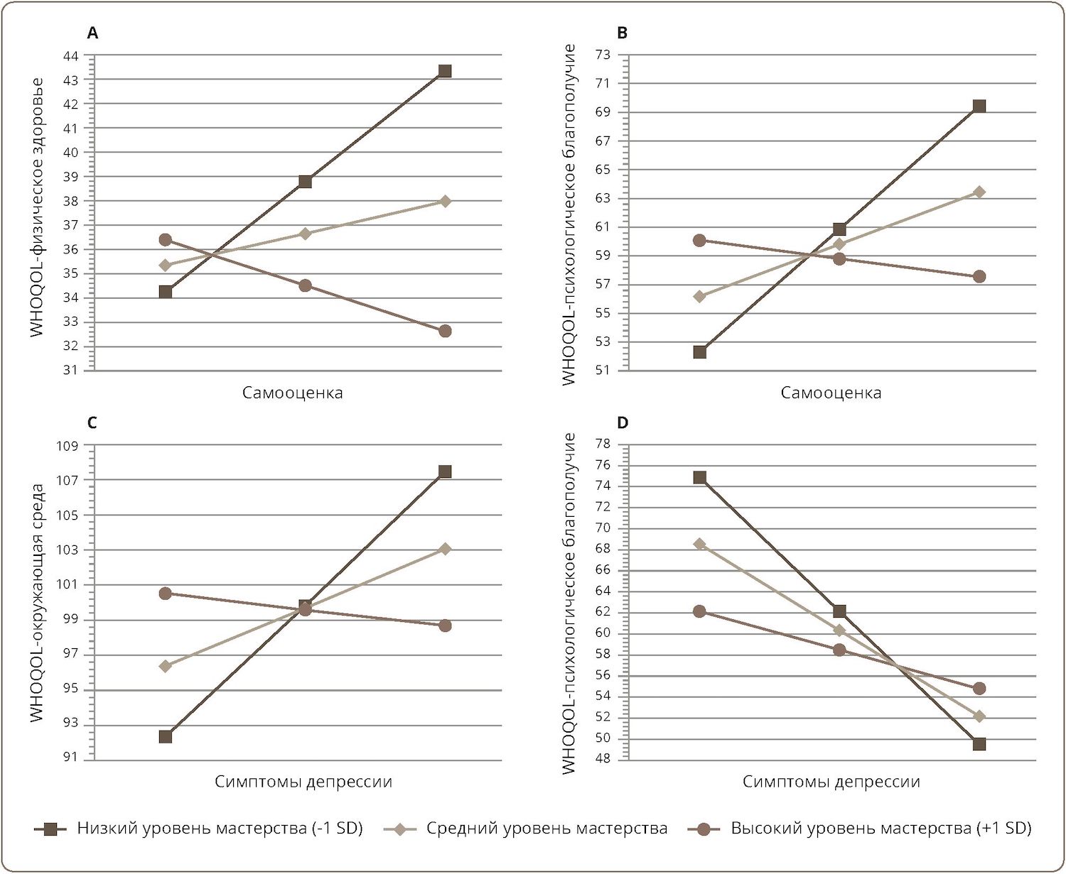 Oppositely, higher levels of mastery may also have a protective value. Across groups, relationships between self-esteem, depressive symptoms, and quality of life were non-significant when mastery was high, suggesting that higher levels of mastery may protect against the negative impact of low self-esteem and depressive symptoms on quality of life that were observed when mastery was low. Higher levels of mastery may allow persons to better make sense of, tolerate, and respond to the distress associated with low self-esteem and depressive symptoms, resulting in a better quality of life. These results suggest that for those with eating disorders, it may be beneficial to develop metacognitive mastery skills in order to reduce the negative impact on quality of life in these groups. Of note, these moderating relationships were consistently present for those with bulimia across several quality-of-life domains; however, only one model in the anorexia group proved significant, indicating that lower self-esteem was associated with lower quality of life in the domain of social relationships. Thus, it appears that mastery may similarly affect both anorexia and bulimia. But further research is needed to investigate this.