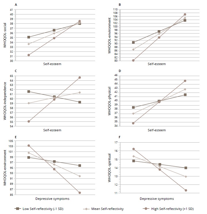 The results of the moderation analyses for self-reflectivity in the anorexia group can be seen in Table 2. Significant interactions were found in moderation models examining the relationships between RSES and WHOQOL-social, WHOQOL-physical, and WHOQOL-independence. Overall, results indicated that when self-reflectivity was high, lower self-esteem was associated with poorer quality of life. At lower levels of self-reflectivity, these relationships became non-significant. Johnson-Neyman values were similar; for WHOQOL-social, scores at or above 3.06 on self-reflectivity (32.5% of the sample) exhibited a significant relationship, while for WHOQOL-physical, scores at or above 3.13 (32.5%) exhibited a significant relationship. For WHOQOL-independence, scores at or above 3.63 on self-reflectivity (25%) exhibited a significant relationship. Self-reflectivity also significantly moderated the relationship between RSES and WHOQOL-environment. At all levels of self-reflectivity, lower self-esteem was associated with poorer quality of life, but the effect was stronger when self-reflectivity was high. There were no statistically significant transition points found using the Johnson-Neyman technique (see Figure 1 for graphs of these interactions). No significant interactions were found in the models examining the relationships between RSES and WHOQOL-psychological or WHOQOL-spiritual.