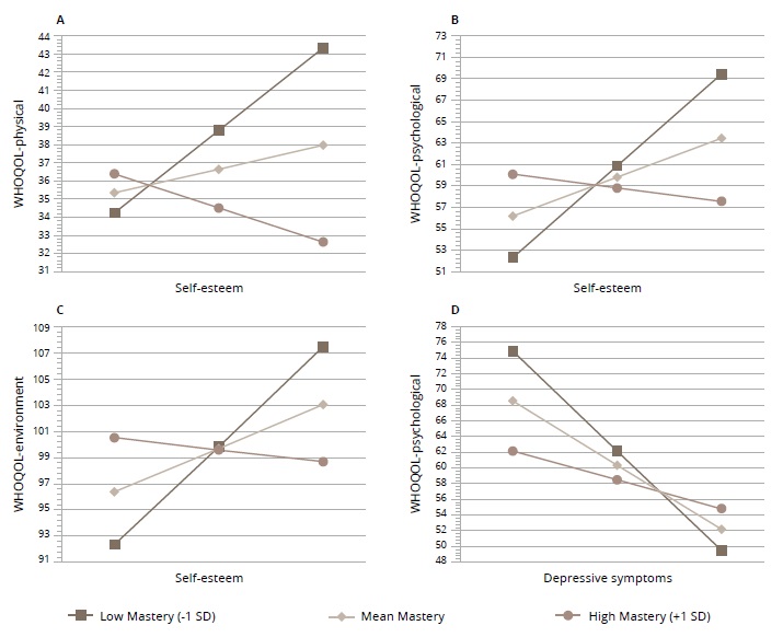 Oppositely, higher levels of mastery may also have a protective value. Across groups, relationships between self-esteem, depressive symptoms, and quality of life were non-significant when mastery was high, suggesting that higher levels of mastery may protect against the negative impact of low self-esteem and depressive symptoms on quality of life that were observed when mastery was low. Higher levels of mastery may allow persons to better make sense of, tolerate, and respond to the distress associated with low self-esteem and depressive symptoms, resulting in a better quality of life. These results suggest that for those with eating disorders, it may be beneficial to develop metacognitive mastery skills in order to reduce the negative impact on quality of life in these groups. Of note, these moderating relationships were consistently present for those with bulimia across several quality-of-life domains; however, only one model in the anorexia group proved significant, indicating that lower self-esteem was associated with lower quality of life in the domain of social relationships. Thus, it appears that mastery may similarly affect both anorexia and bulimia. But further research is needed to investigate this.