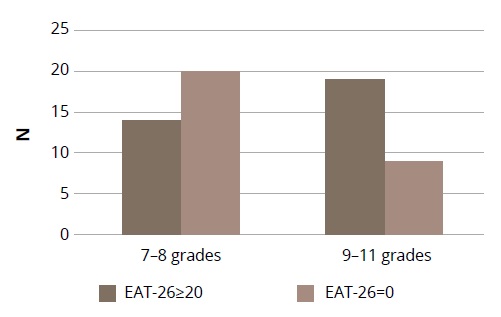 In accordance with the generally accepted cut-off criterion for the EAT-26, groups of girls with high (EAT-26≥20) and zero (EAT-26=0) values of the total EAT-26 were identified. The 2x2 contingency table was analyzed with the Pearson’s chi-square test of independence of distribution of the proportions of girls with high and zero ED risk depending on the grade (7–8 and 9–11 grades).