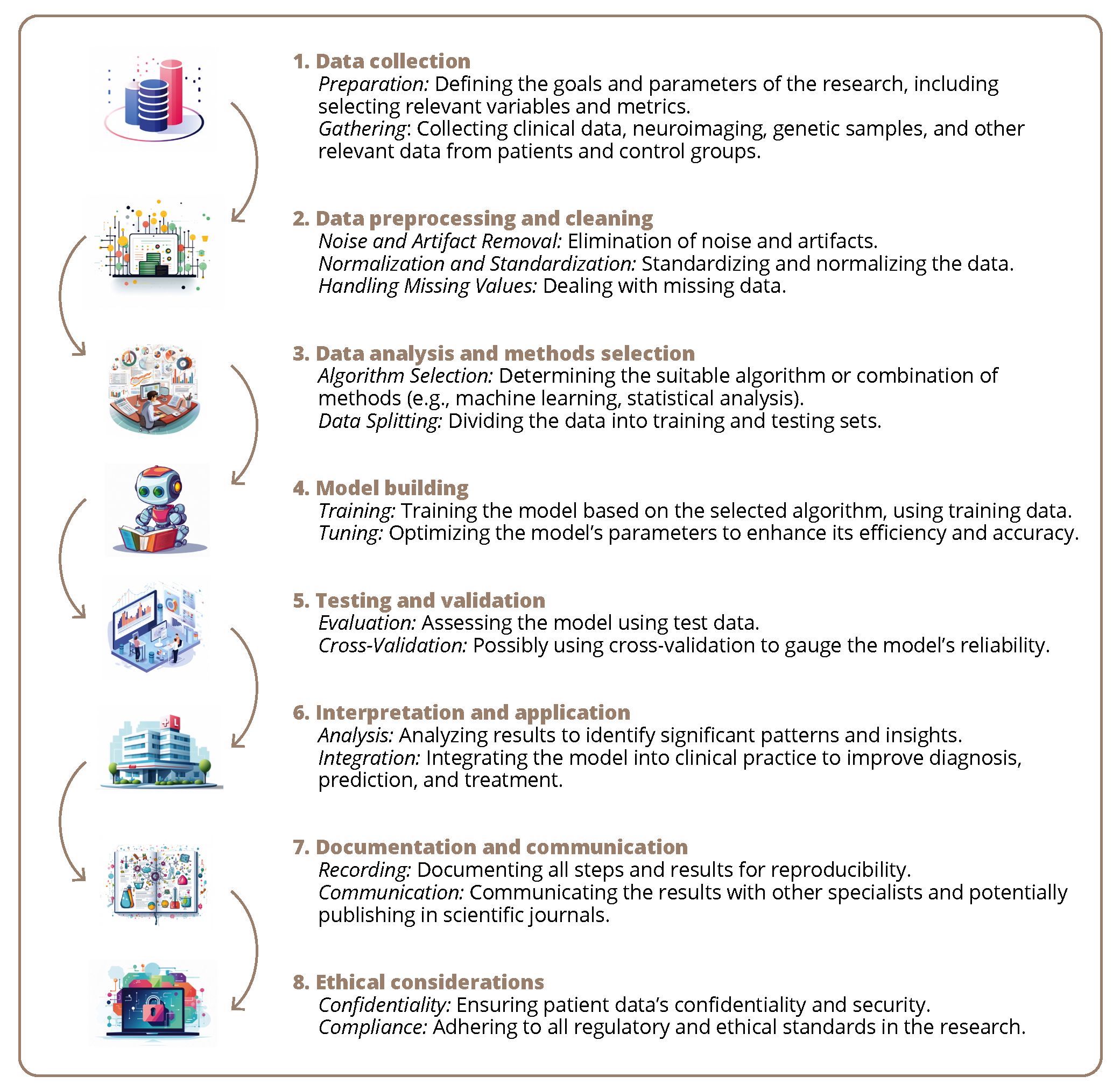 A key challenge in CP is to develop computational models that effectively reproduce the complexity of psychiatric disorders and account for individual differences in symptomatology and treatment response [11]. This process often follows a generalized schema that includes stages such as data collection, preprocessing, modeling, testing, interpretation, and ethical considerations. A detailed illustration of this process can be found in Figure 1.