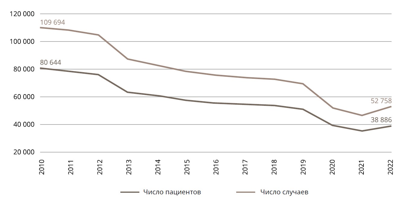 Рисунок 2. Оборот психиатрических стационарных учреждений в системе здравоохранения Венгрии в 2010–2022 гг. (на 10 млн населения).