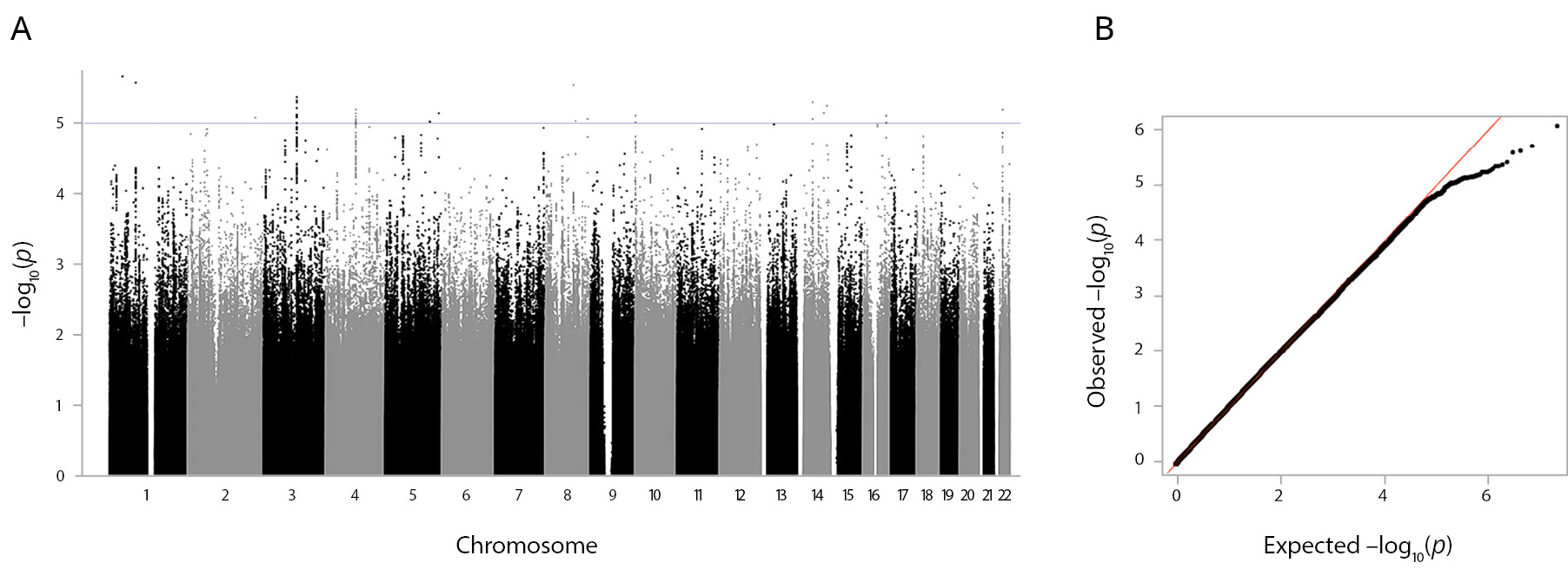 Figure 1. GWAS results of the lifetime anhedonia phenotype. Note: (A) The Manhattan plot for the lifetime anhedonia phenotype. Association analysis p values for each SNP are plotted (as –log10[p]) vs the chromosomal position. The blue line indicates the significance level p <1x10-5. (B) The QQ plot for the lifetime anhedonia phenotype. The QQ plot shows the observed vs expected p-value for every variant.