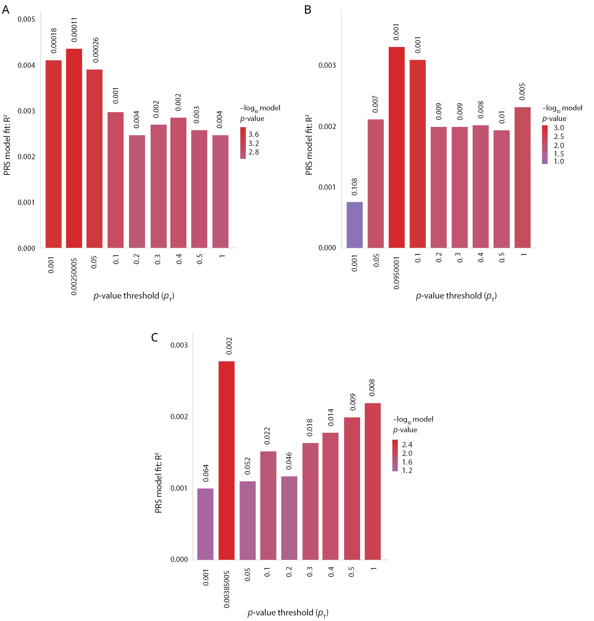 Figure 2. Polygenic risk scores for depression, bipolar disorder, and schizophrenia are significantly associated with the lifetime anhedonia phenotype. Note: The x-axis shows the p-value threshold used to select SNPs from the discovery GWAS: (A) meta-analysis of depression from the PGC and UK Biobank; (B) bipolar disorder PGC; (C) schizophrenia PGC (2nd wave). The y-axis shows the percentage variance explained on the liability scale. p-values of the association between polygenic scores and the lifetime anhedonia phenotype are shown above each bar.