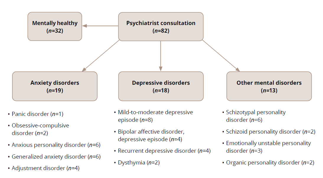 Based on the psychiatrists’ evaluations, among the 82 participants who had undergone consultation, 32 (39%) were deemed mentally healthy. Affective disorders characterized by a predominant depressive syndrome (referred to as “depressive disorders”) were identified in 19 participants (23%). Neurotic disorders with a predominance of anxiety symptoms (“anxiety disorders”) were found in 18 participants (22%), while other mental disorders were diagnosed in 13 participants (16%) (Figure 1).