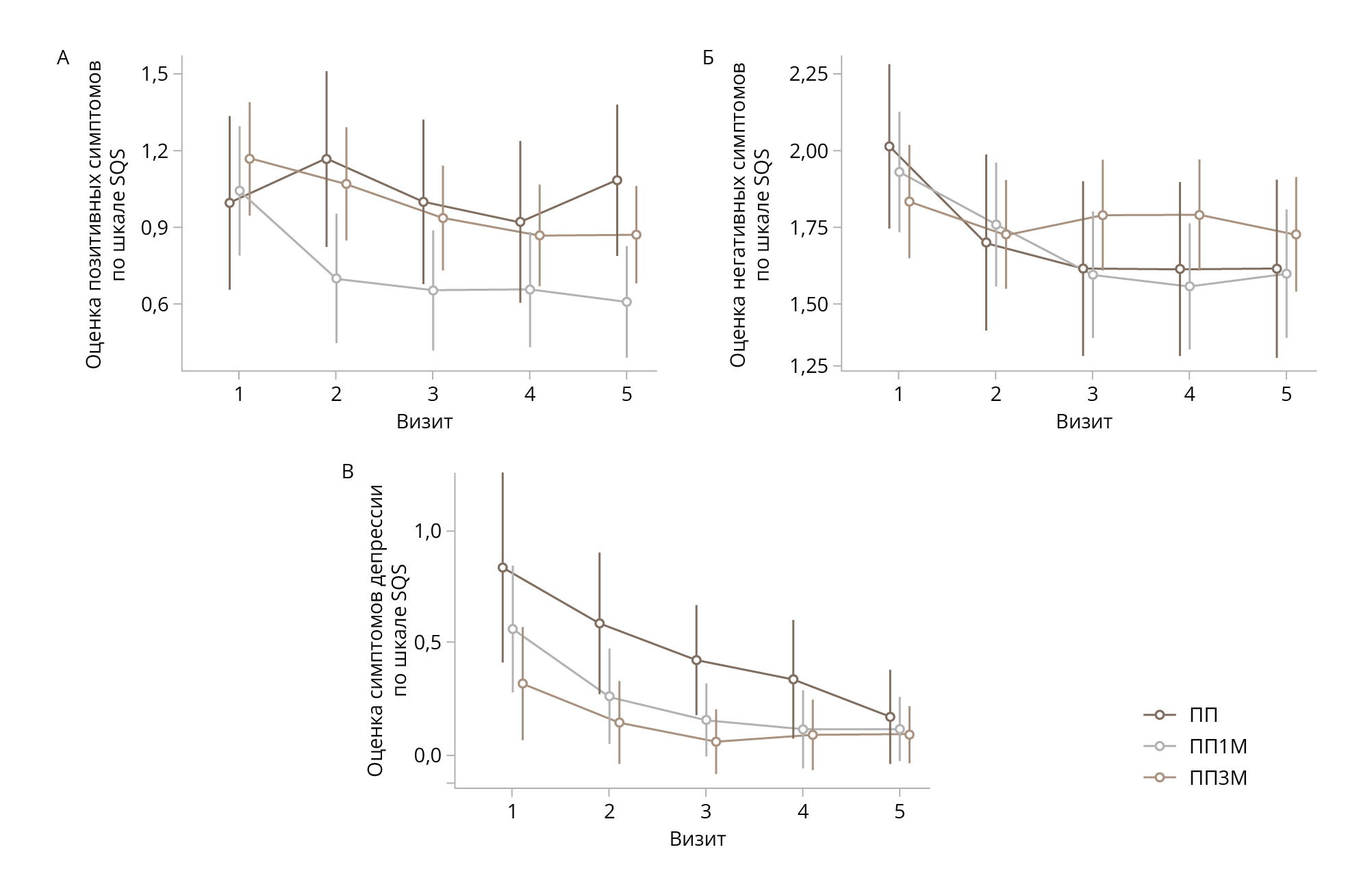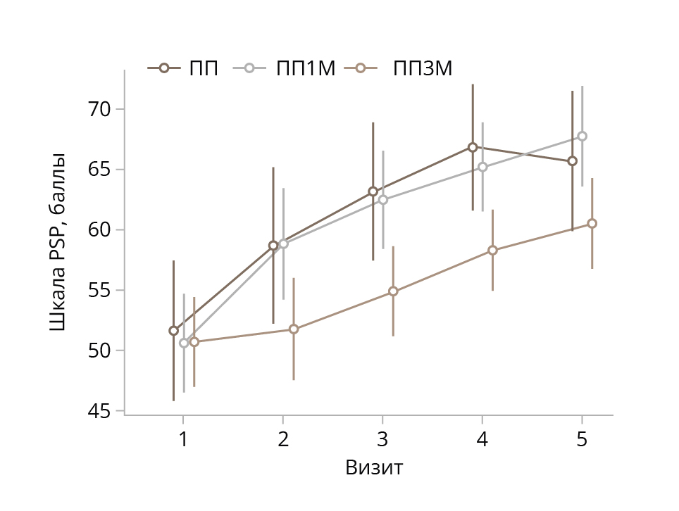 РЕЗУЛЬТАТЫ: Терапия во всех группах привела к статистически значимому снижению выраженности позитивных симптомов (p <0,001). При этом более чувствительными к терапии оказались галлюцинации (p <0,001), тогда как остаточный бред оставался более устойчив к терапии. В группе ПП1М и ПП3М больше пациентов полностью завершили программу исследования (n=24, 48,0% и n=30, 58,8% соответственно) по сравнению с группой ПО (n=11, 20,4%). При этом в группе ПП3М отмечалось наилучшее следование назначенной схеме терапии, максимальное число пациентов, полностью завершивших исследование, равное с другими группами количество случаев обострений или недостаточной эффективности.