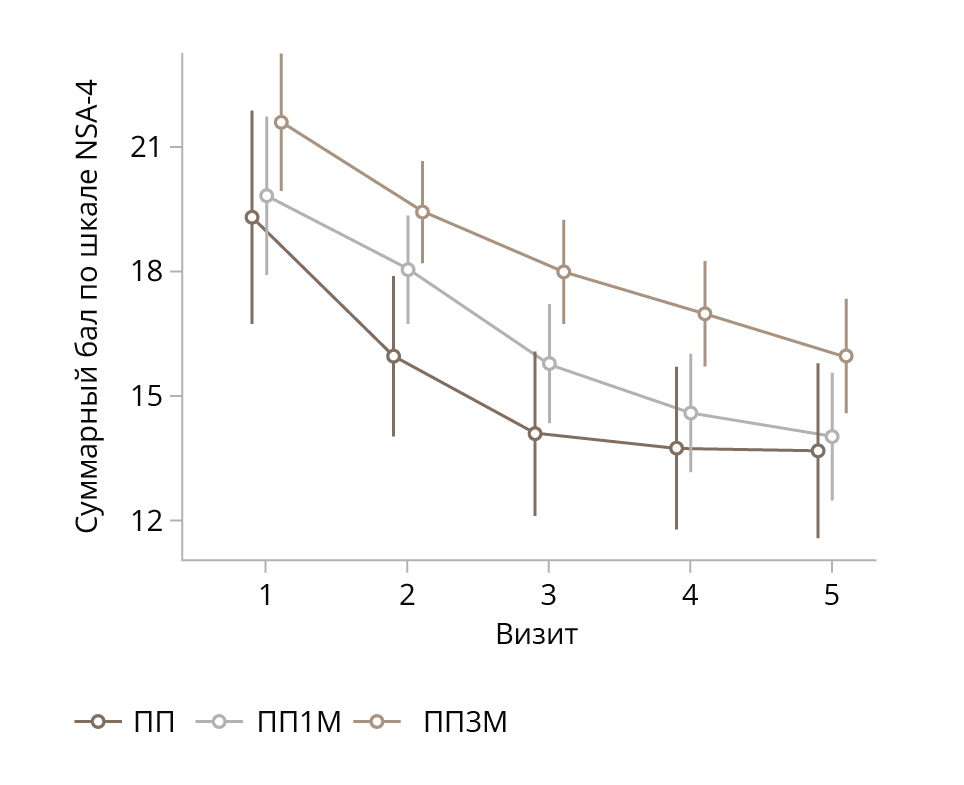 Первичные и дополнительные оцениваемые параметры изучались в отдельной модели ANOVA для повторных измерений с фиксированным фактором группы с оценкой межгрупповых контрастов по динамике соответствующей шкалы между визитом 1 и визитами 2, 3, 4 и 5.