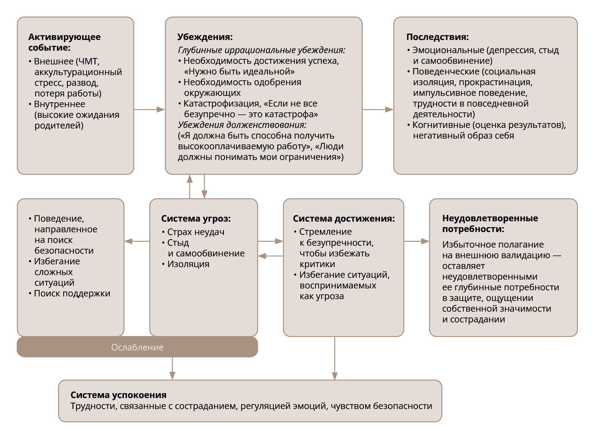 The activation of her threat-management capability fuels her drive, leading to behavior that seeks to achieve perfection and validation. When this behavior fails to alleviate her distress, a sense of disappointment that reinforces her core beliefs takes hold, further straining her soothing system. This cycle results in constant pressure and fear, which manifests itself in depression, low self-esteem, and social withdrawal. The cycle of distress she is trapped in is presented on Figure 1.