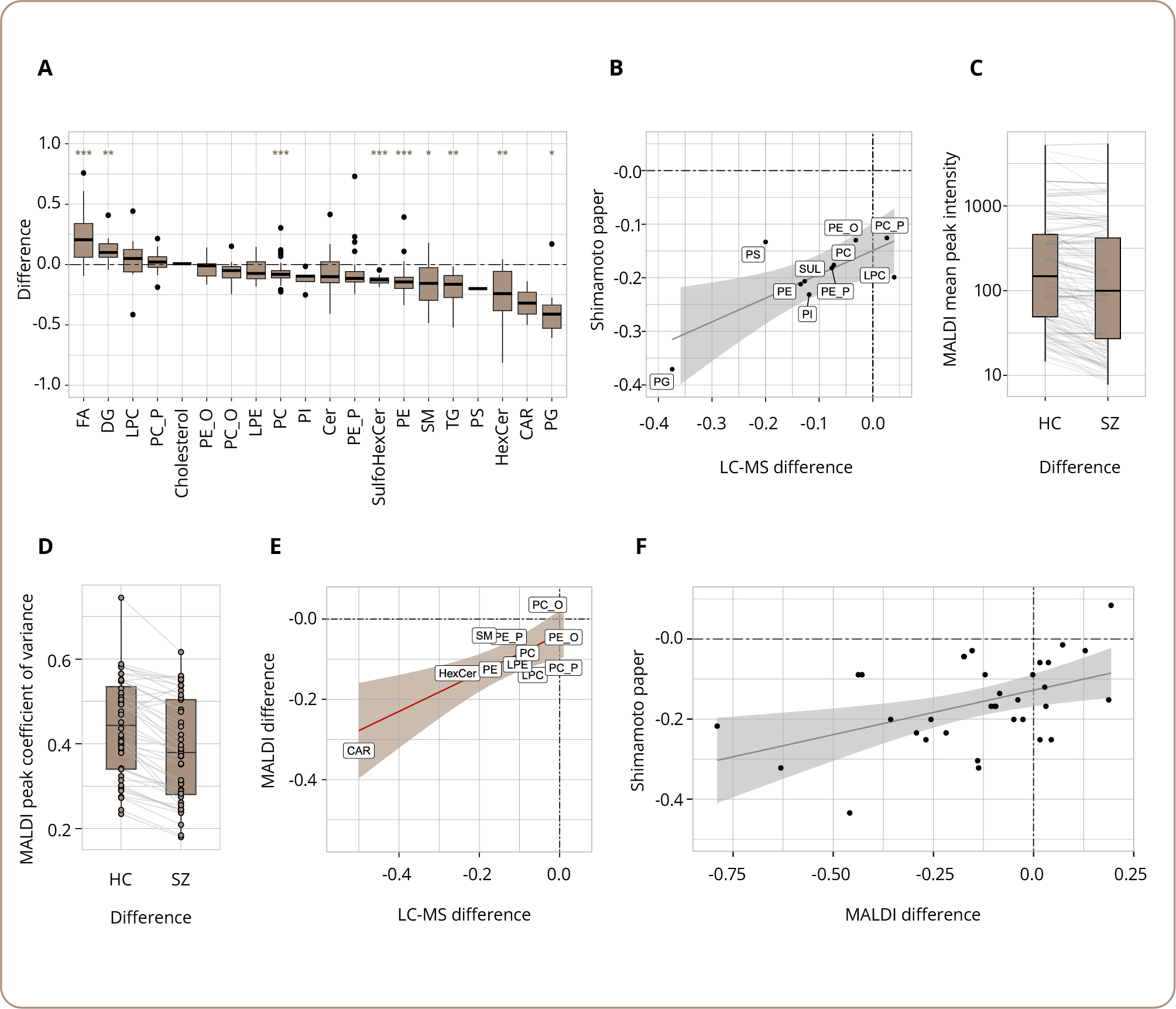 Note: (A) Boxplots representing differences in lipid intensities between SZ patients and the HC for each lipid class, measured with HPLC-MS. Asterisks reflect the statistical significance of the difference evaluated via a one-sample Student t-test of the differences between groups vs zero for each class (*** — p <0.001; ** — p <0.01; * — p <0.05; p-values corrected for multiple hypothesis testing). Positive values represent higher levels in the schizophrenia group. (B) Correlation of average differences for each lipid class correlated to the published paper on the corpus callosum lipidome in schizophrenia by Shimamoto et al. [7]. The correlation is calculated based on the same 10 lipid classes measured in two works. (C) Boxplots of the peak intensity distribution for the MALDI imaging experiment. Each line connects the same peak in two sample groups. One-sample Student t-test was used to determine whether the distribution of the differences between peak averages between the two groups differed statistically significantly from zero (p=0.0013). (D) Boxplots of the coefficient of variance calculated for each MALDI peak within each group. Statistical significance of the differences between the coefficients of variance evaluated via the Wilcoxon signed-rank test (p <4e-10). Lines connect the same lipid intensity averaged within different groups. (E) Correlation of average differences for each lipid class between the two types of measurements (HPLC-MS and MALDI-MSI). (F) Correlation with [7] for the MALDI imaging experiment. Peaks-plotting was based on mass-matching, and one dot represents one matched peak.