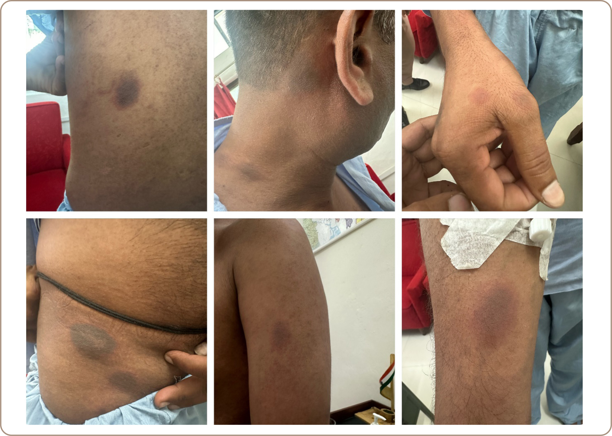 09 July 2024 | Developed multiple vesicles over erythematous hyperpigmented targetoid macules located over both upper limbs, anterior and posterior trunk, and back of neck. | Diagnosed as a case of GBFDE, with chlordiazepoxide being the offered drug. Chlordiazepoxide stopped immediately. |