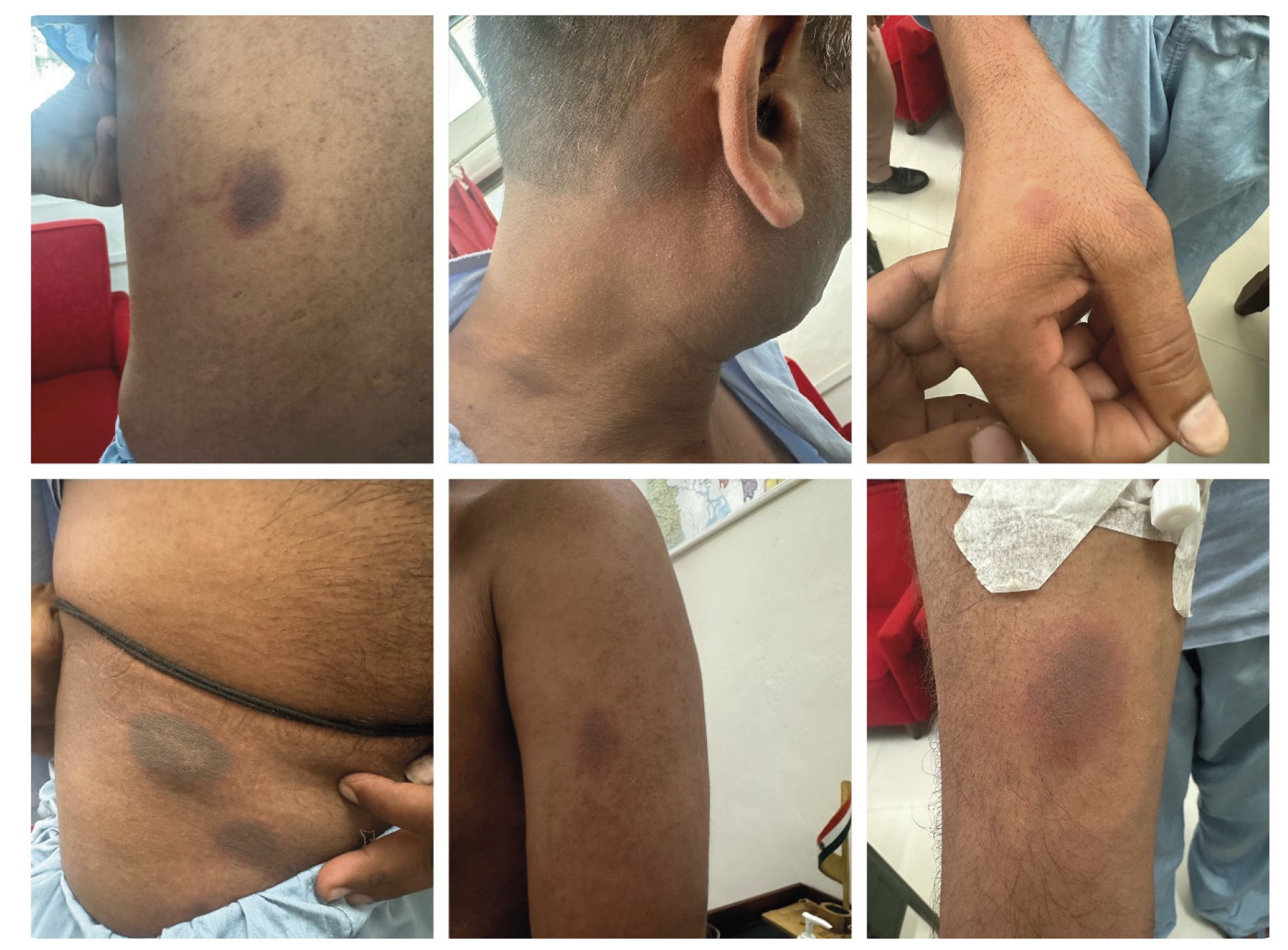 16 July 2024 | — | Lesions resolved gradually over a period of one week, leaving behind dark grey huperpigmented lesions. |