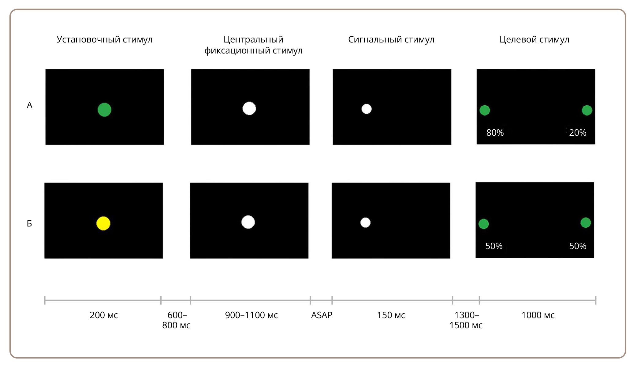 Note: ASAP — as soon as possible; A — the target stimulus appears on the same side as the cue stimulus in 80% of the cases; B — the target stimulus appears on the same side as the cue stimulus in 50% of the cases.