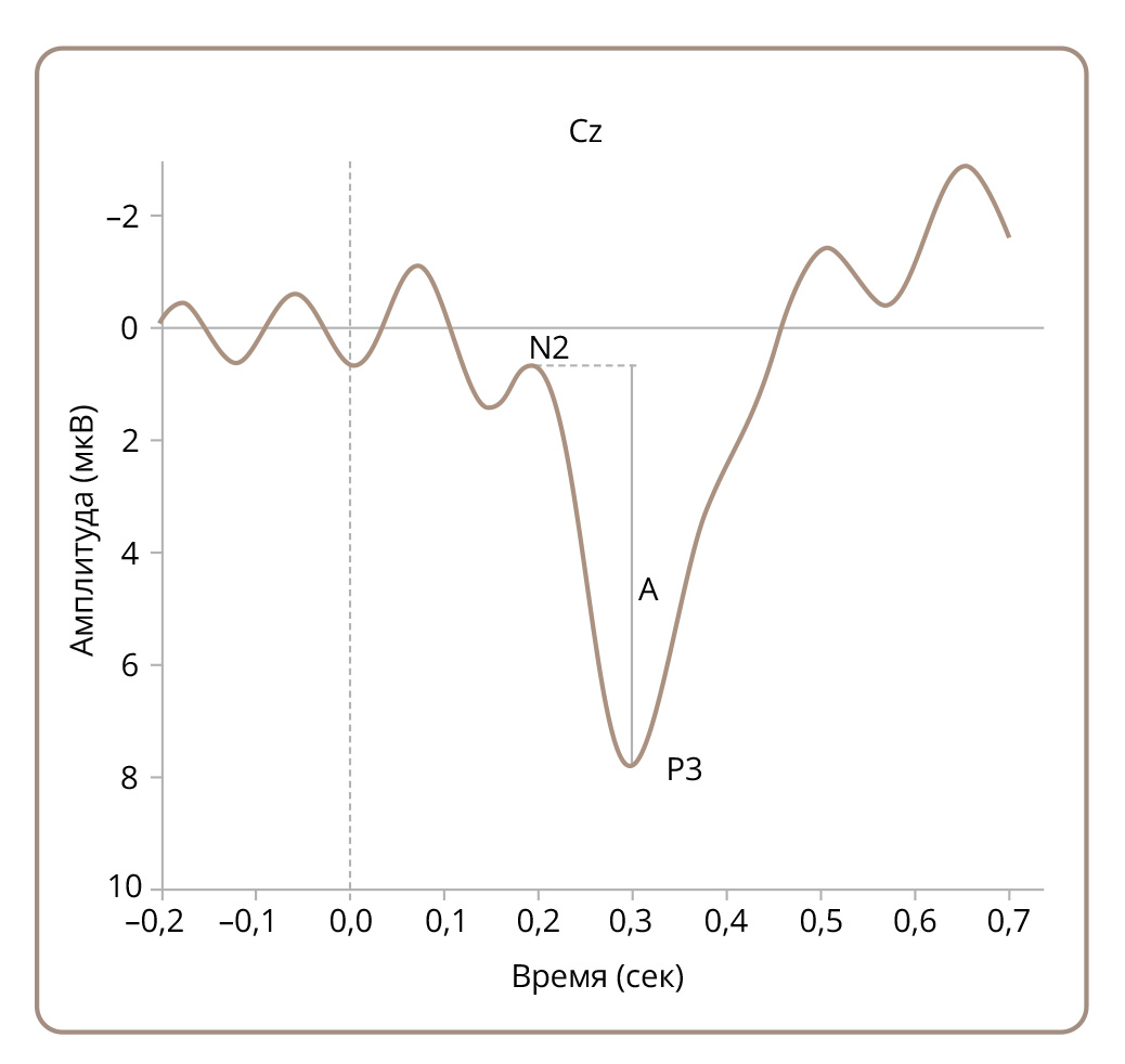 Note: The method for measuring the amplitude (A) of the P3 component is indicated. N2 — the preceding negative peak. Vertical dashed line — the time of stimulus presentation.