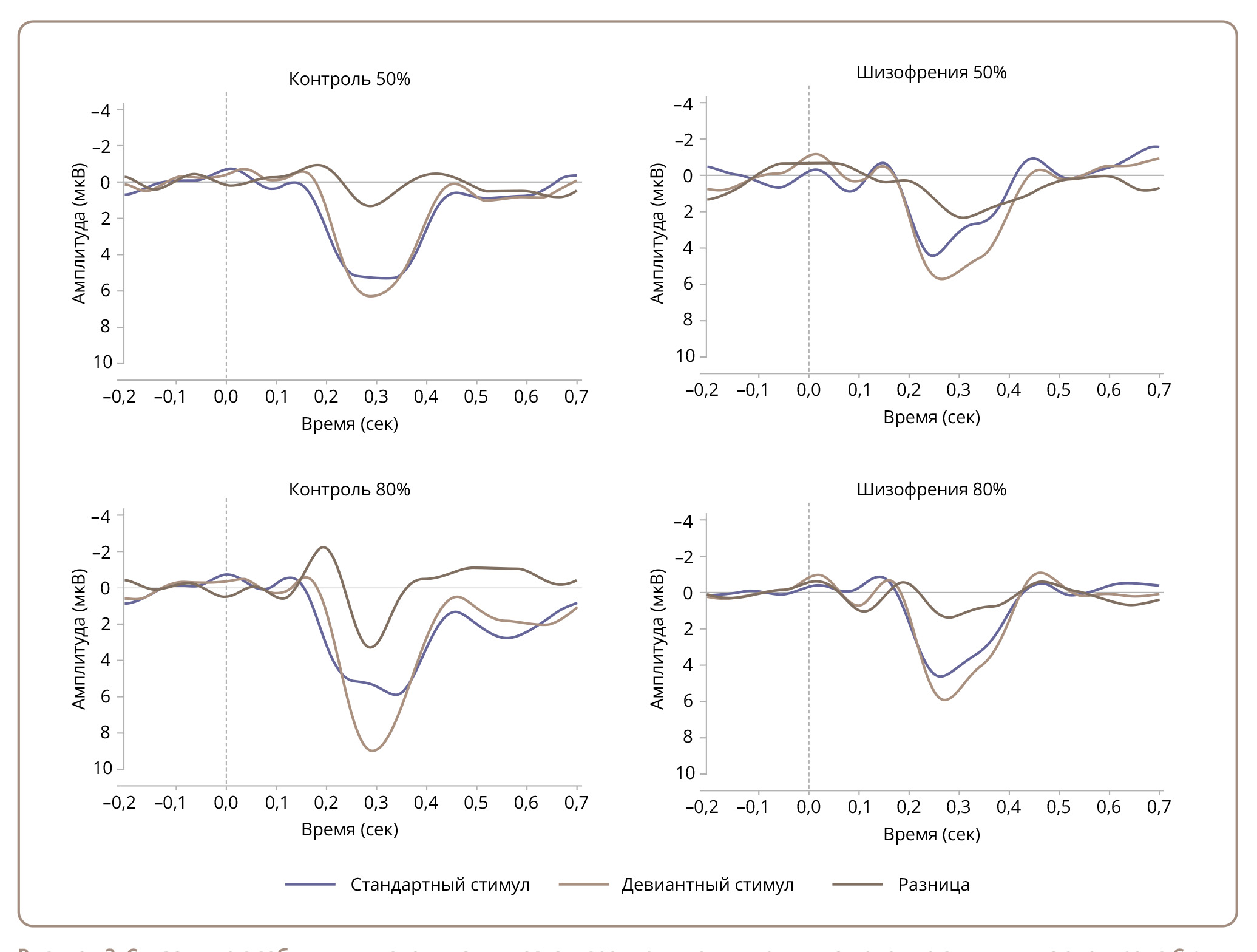 The amplitudes of ERP components were compared using repeated measures analysis of variance with the between-subjects factor “group” (n=2, schizophrenia and control groups). In the analysis of CNV, P3, and MMN, the following within-subject factors were taken into account: the probability of the cue and target stimuli matching (n=2: 50% and 80%) and electrode location (n=3: frontal, central, and parietal). Additionally, when analyzing the CNV, the analysis interval was taken into account (n=2: early [900–600 ms before the peripheral stimulus] and late [300–0 ms before the peripheral stimulus]), while for the P3 analysis, the match between the cue and target stimuli was taken into account (n=2: standard and deviant stimuli). The selection of the listed factors is based on theoretical premises and the methodology employed in the study of anticipation.