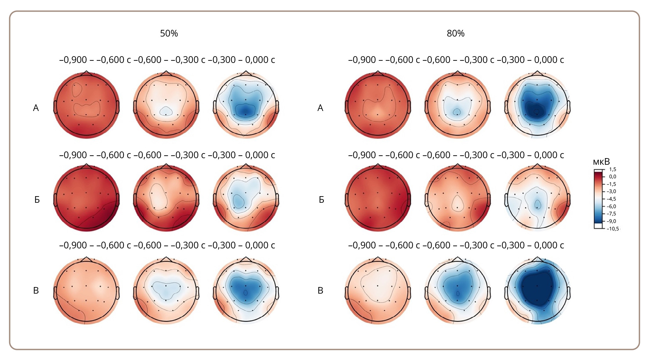 Note: The left column represents the 50% probability condition, and the right column represents the 80% probability condition. Averaged amplitudes for the specified time intervals are shown. A — control group; B — first schizophrenia subgroup (CNV amplitude was higher in the 50% condition than in the 80% condition, or showed no difference between the two conditions); C — second schizophrenia subgroup (CNV amplitude was higher in the 80% condition versus the 50% condition).