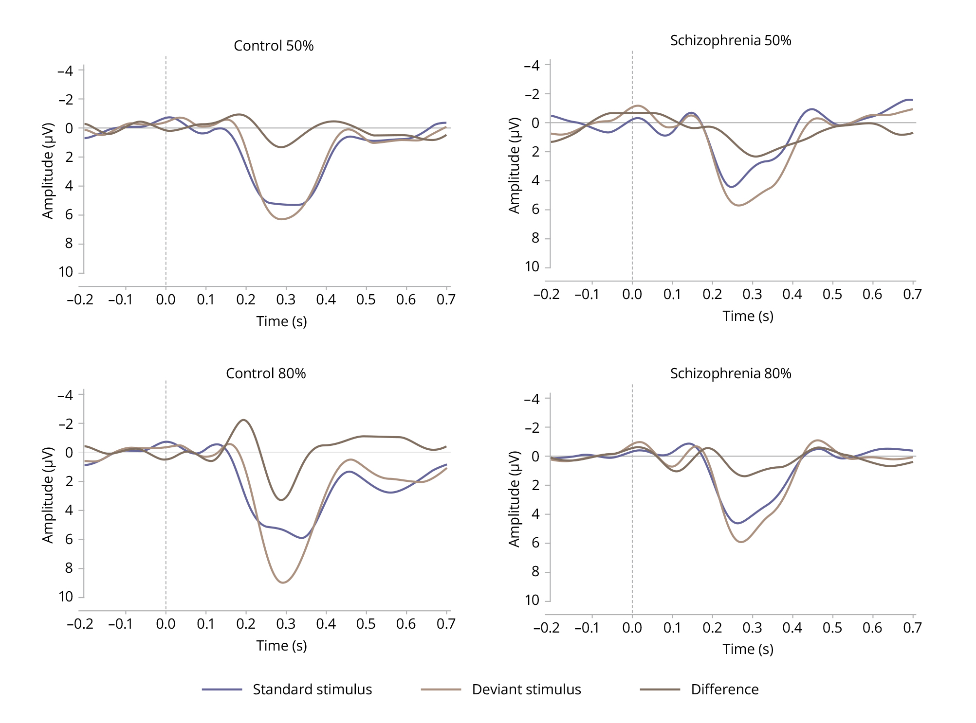 The analysis of the P3 component in mentally healthy individuals showed an increased amplitude to the deviant stimuli under the 80% matching condition. Schizophrenia patients showed an increase in the amplitude to the deviant stimuli in the 50% probability condition and a decrease in the amplitude to the deviant stimuli in the 80% condition, which reflects the aberrant probability assessment [52, 53]. This supports the hypothesis that prediction errors in schizophrenia patients are generated in response to stimuli that are less significant for predictive processes (e.g., a stimulus with a 50% probability) and are linked to an impaired ability to identify significant stimuli (aberrant salience) [49, 54]. The paradigm employing deviant stimuli with equal probability to standard stimuli may represent a novel approach for evaluating impairment in probabilistic prediction and anticipation in schizophrenia patients.