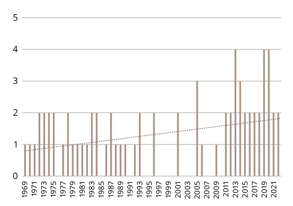 Figure 1. Citations of the paper by Lapin I.P. and Oksenkrug G.F. (1969) over time in articles related to etiology and pathogenesis of psychiatric disorders.