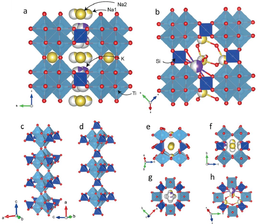 Кристаллическая структура ситинакита (рис. 7, a, b) основана на кубаноподобных кластерах [Ti4O4]8+, образованных четырьмя октаэдрами TiO6 с общими гранями. Кластеры объединены через общие вершины в бесконечные колонны [Ti4O4]8+∞ вдоль [001] и соединяются в каркас через общие вершины с SiO4-тетраэдрами вдоль направлений [100] и [010]. В минералах группы иванюкита, в отличие от ситинакита, кубаноподобные кластеры [Ti4O4]8+ связаны общими вершинами с тетраэдрами SiO4 вдоль направлений [001], [100] и [010] (рис. 7, b, d). Гетерополиэдрический каркас ситинакита содержит трехмерную систему пересекающихся каналов, ориентированных вдоль основных кристаллографических направлений тетрагональной ячейки. Канал I (рис. 7, e) проходит вдоль направления [001] и характеризуется восьмиугольным сечением с эффективным диаметром (по номенклатуре ИЮПАК для неизометричных каналов с эллиптическим сечением используются длины главной и малой осей минус сумма двух ионных радиусов кислорода 2.7 Å), равных 2.78 × × 3.50 Å2 (McCusker, 2023). Каналы II типа параллельны [100] и [010], тогда как каналы типа III параллельны [110] (рис. 7, f, g). Каналы II и III имеют гексагональное поперечное сечение и меньший эффективный диаметры — 2.16 × 3.31 Å2 и 1.31 × 3.31 Å2 соответственно. Эти каналы заполнены ионами Na+ и K+, а также молекулами H2O. Каналы в кристаллической структуре иванюкита (рис. 7, h) аналогичны каналам I в ситинаките и направлены вдоль всех главных направлений. При миграции Sr2+ c эффективным радиусом 1.32 Å не возникает никаких затруднений ни в ситинаките, ни в иванюките. При этом эффективный радиус Cs+ составляет 2.0 Å, что не позволяет ему мигрировать вдоль каналов III типа в ситинаките, в то время как возможность миграции по всем направлениям в иванюките сохраняется за счет одинаковых каналов по всем осям. Таким образом, часть каналов, пригодная для миграции Sr2+ в ситинаките, остается непригодной для миграции Cs+, чем, вероятно, и объясняется разница в сорбционной ёмкости ситинакита по к этому катиону.