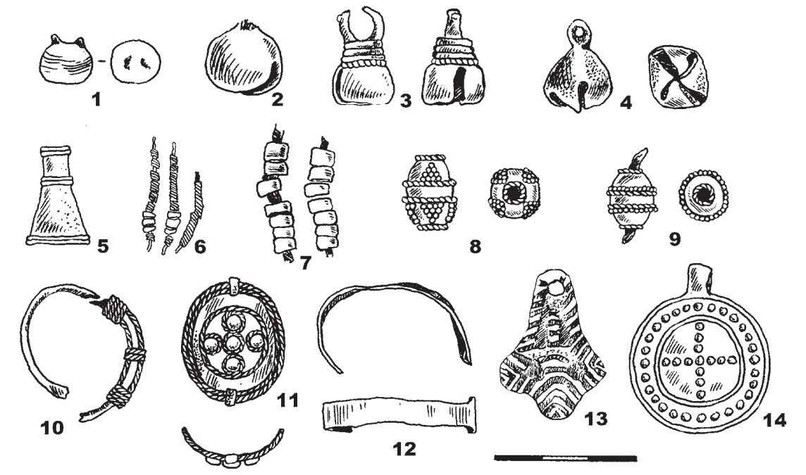 В рамках обозначенной проблемы значительный интерес представляет собой погребение № 59 Кокпомъягского могильника; насыщенное изделиями из цветных и благородных металлов; как привозными; так и изготовленными местными мастерами. Погребение размерами 245 × 125 × 67 см было совершено способом ингумации. Судя по набору украшений; отсутствию предметов вооружения; предметов; связанных с производственной деятельностью мужчин; погребение женское. В засыпи погребения были найдены многочисленные фрагменты лепного тонкостенного сосуда; украшенного по венчику насечкой; залегавшие в разных частях могильной ямы. Остальные предметы погребального инвентаря расположены на дне ямы; на уровне сохранившихся костей погребенного. К ним относятся (рис. 1): бронзовая шаровидная пуговица (1); бронзовый шаровидный бубенчик с линейной прорезью (2); бронзовый колокольчик с обломанным ушком (3); латунный грушевидный бубенчик с крестовидной прорезью (4); бронзовая конусовидная пронизка; украшенная тремя сдвоенными гладкими рельефными полосками в верхней ее части и в основании (5); бронзовые спиралевидные пронизки (6); зонные стеклянные и бронзовые кольцевидные бусины (7); серебряная желудевидная зернофилигранная бусина (8); серебряная зернофилигранная бочонковидная бусина от височного кольца; состоящая из двух полусфер; соединение которых осуществлено гладкой серебряной пластинкой; края бусины обрамлены филигранными рядами; на кольце бусина закреплена проволочкой (9); серебряное тонкопроволочное кольцо с филигранью (10); серебряная бляшка; использовавшаяся в качестве подвески; украшенная в центре пятью шариками зерни крупного размера на филигранных подложках; расположенных крестовидно и обрамленных рядами филиграни; на обратной стороне в центре с остатками припоя (11); фрагмент медного пластинчатото кольцевидного предмета; предположительно браслета (12); бронзовая лапчатая подвеска (13); бронзовая монетовидная штампованная подвеска с ушком для крепления; орнаментированная крестовидным узором в центре и ложной зернью по краю (14).